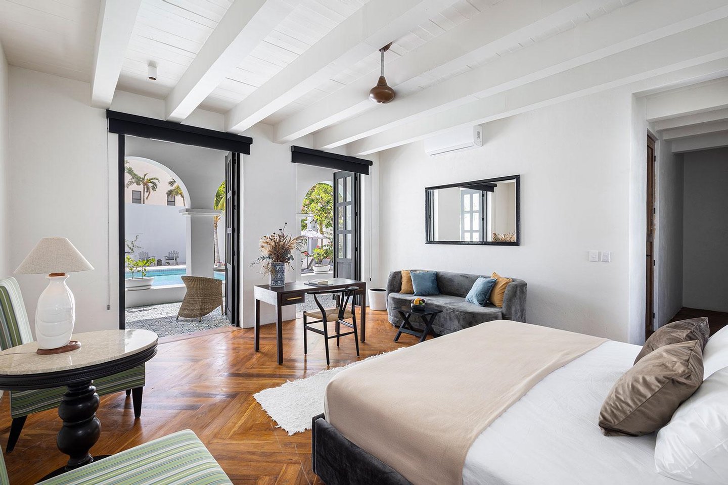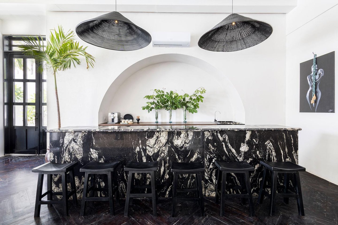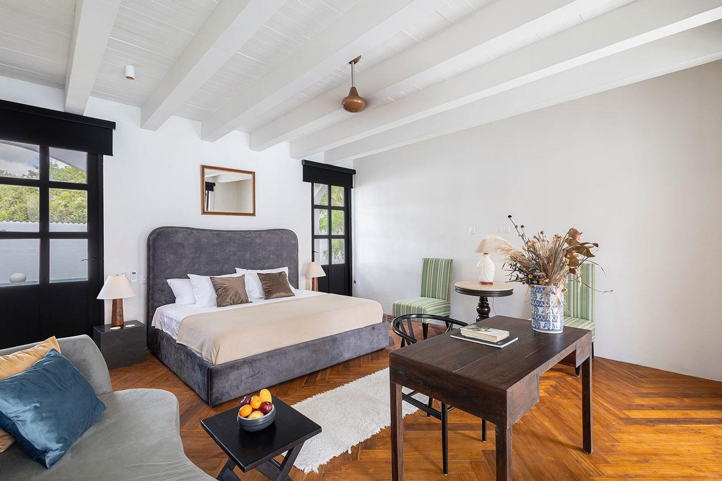 Jeder Winkel des Anwesens zeugt von durchdachter Handwerkskunst und gehobener Gastfreundschaft. Verschlungene Wege durch tropische Gärten verbinden Samtlounges, einen 200 Jahre alten Flügel und gemütliche Ecken mit privaten Terrassen. Die Gäste können sich in zwei separaten Swimmingpools entspannen - einer ideal für gesellige Nachmittage, der andere ein ruhiges Tauchbecken vor der Master-Suite mit Blick auf das Baldachin.