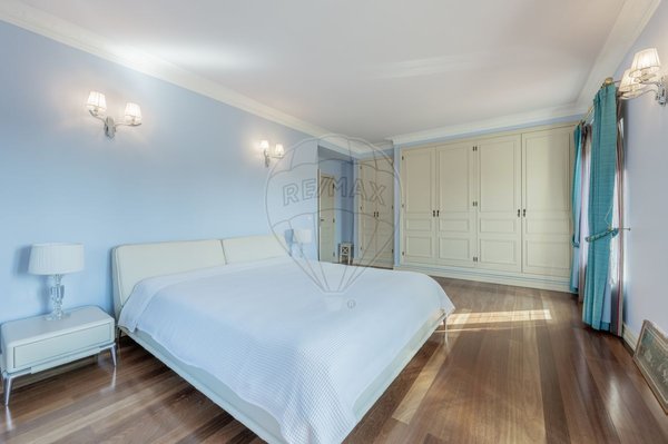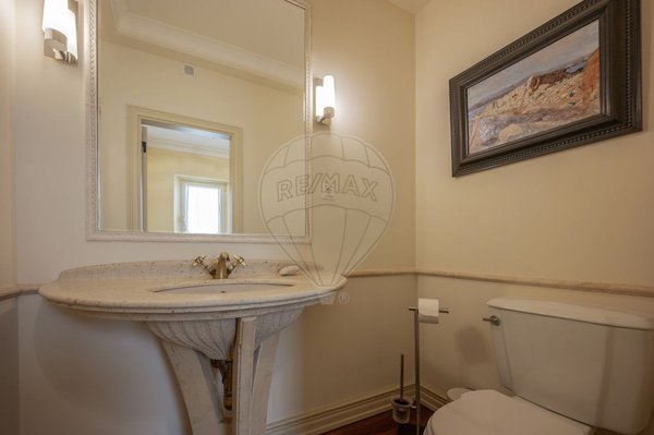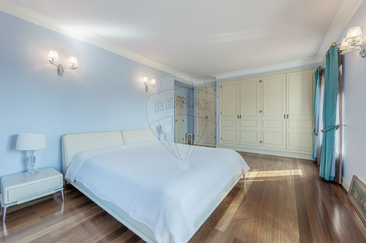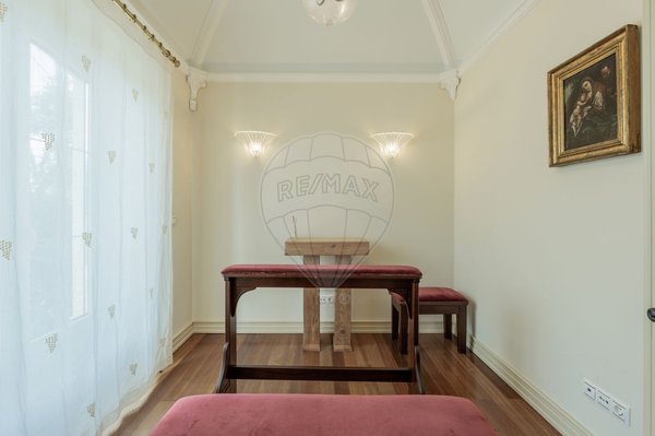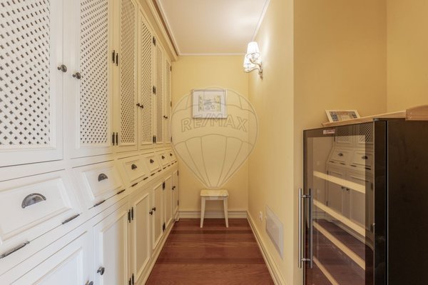 Dieses Haus mit klassischen Linien hat eine traditionelle portugiesische Architektur, in der die große Helligkeit und Fluidität der Räume auf raffinierte Oberflächen trifft. Im Inneren stechen die hohen und aufwendigen Decken (3,40 m) hervor, im Wohnzimmer, in der schönen und geräumigen Küche mit Lioz-Naturstein-Arbeitsplatten und hochwertiger Ausstattung und im Esszimmer, letzteres mit dem unverwechselbaren Touch von lackiertem Rindenholz. Die imposante Eingangstür, eine Nachbildung alter Lissabonner Türen aus Massivholz und Aluminiumguss, ist ein