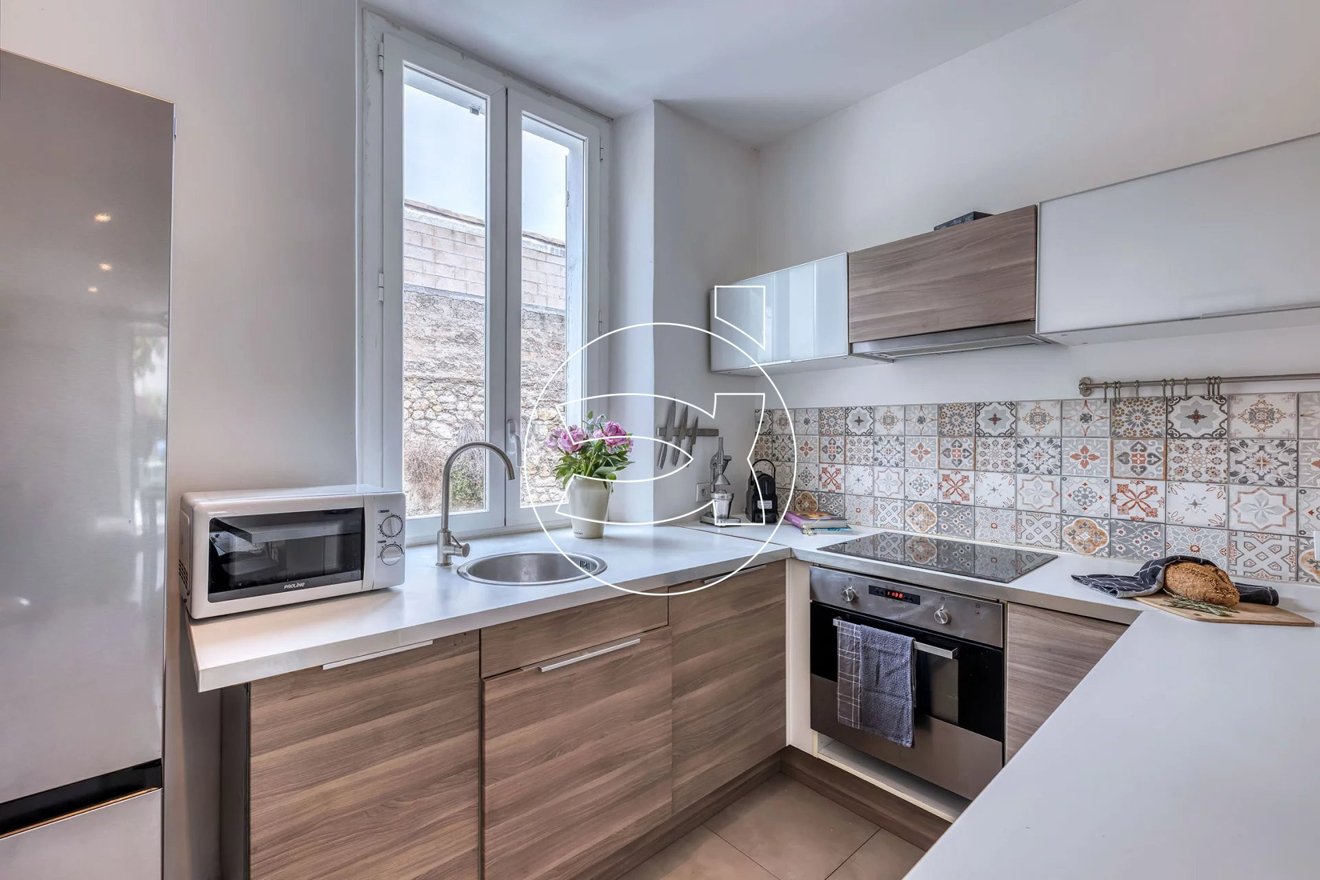 Genießen Sie die französische Idylle und Ruhe in dieser einzigartigen Wohnung, ideal gelegen in einer ruhigen Sackgasse — an der Grenze zwischen den begehrten Vierteln Petit Juas und Stanislas — nur 20 Gehminuten vom Meer und dem Stadtzentrum von Cannes entfernt.