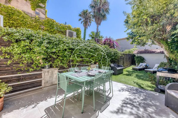 Der private Garten, der kürzlich teilweise gefliest wurde, bietet Platz für einen großen Tisch mit acht Personen. Der übrige Bereich kann als Rasenfläche, Gartenmöbelbereich oder Entspannungszone mit Liegestühlen gestaltet werden. Ein 9 m² großer Schuppen bietet reichlich Stauraum. Die gesamte Anlage strahlt eine echte mediterrane Atmosphäre aus, mit Pflanzen wie Jasmin, Mimose, Avocadobaum und Weinrebe.