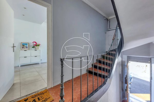 Die Wohnung vermittelt ein wohnliches Gefühl. Sie betreten sie durch eine traditionelle französische Tür und gelangen über eine Treppe zum Haupteingang, wo ein heller, offener Wohnbereich auf Sie wartet.