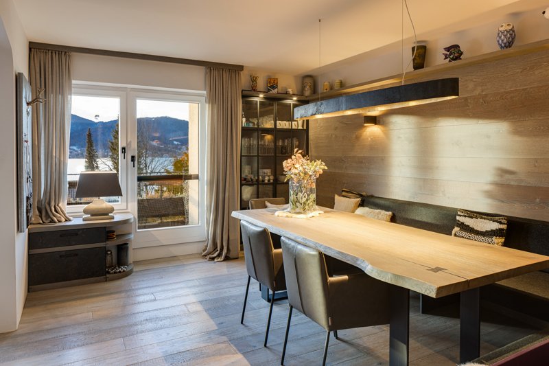 Insgesamt 140 m² Wohnfläche in Obergeschoss und Dachgeschoss, vier Zimmer, zwei Bäder, ein Balkon. Die Küche hat alles, was es benötigt, und erinnert uns an jene Küchen, wo bei guten Partys irgendwann alle zusammenkamen. Der Wohn- und Essbereich ist mehr als großzügig, der Seeblick m-e-g-a.