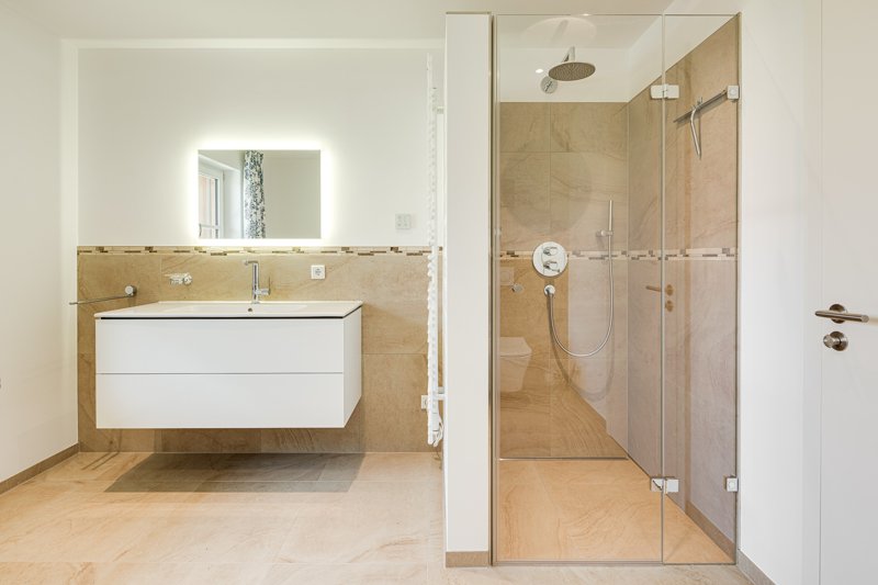 Die Einrichtung wurde durchdacht geplant und hochwertig realisiert. Das zeigt sich an solch praktischen Annehmlichkeiten wie den voluminösen, schreinergefertigten Einbauschränken im Flur und in der separaten Ankleide. Lift, schwellenfreier Zugang, ebenerdige Duschen, elektrische Rollläden – es ist alles da und so, wie man es gerne hätte. Eine in der Wand integrierte Schiebetür öffnet und schließt die Verbindung vom Entree zur Küche. Die Echtholzfenster sind dreifachverglast, das Heizkonzept setzt zukunftsorientiert auf Erdwärme, die Fußbodenheizung lässt sich unabhängig steuern. Der Wirtschaftsraum wäre ebenso als Home-Office geeignet.