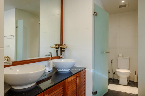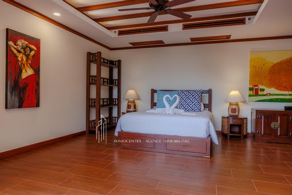Die Villa bietet drei Master-Suiten, alle großzügig geschnitten, mit eigenem Bad und Ankleidezimmer, die Privatsphäre und Komfort für jeden Bewohner gewährleisten. Ein Raum, der dem Wohlbefinden gewidmet ist, mit einem Massagesofa, vervollständigt diesen Ort, der zum Entspannen gedacht ist.