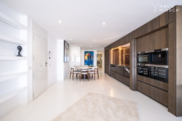 Der offene Wohn-Esszimmer-Bereich mit moderner, offener Küche lädt zum Verweilen ein. Der geräumige offene Wohn-, Ess- und Küchenbereich bietet Zugang zur Terrasse und ermöglicht ein nahtloses Innen-Außen-Wohn-Erlebnis mit einem atemberaubenden Panorama über den Hafen.