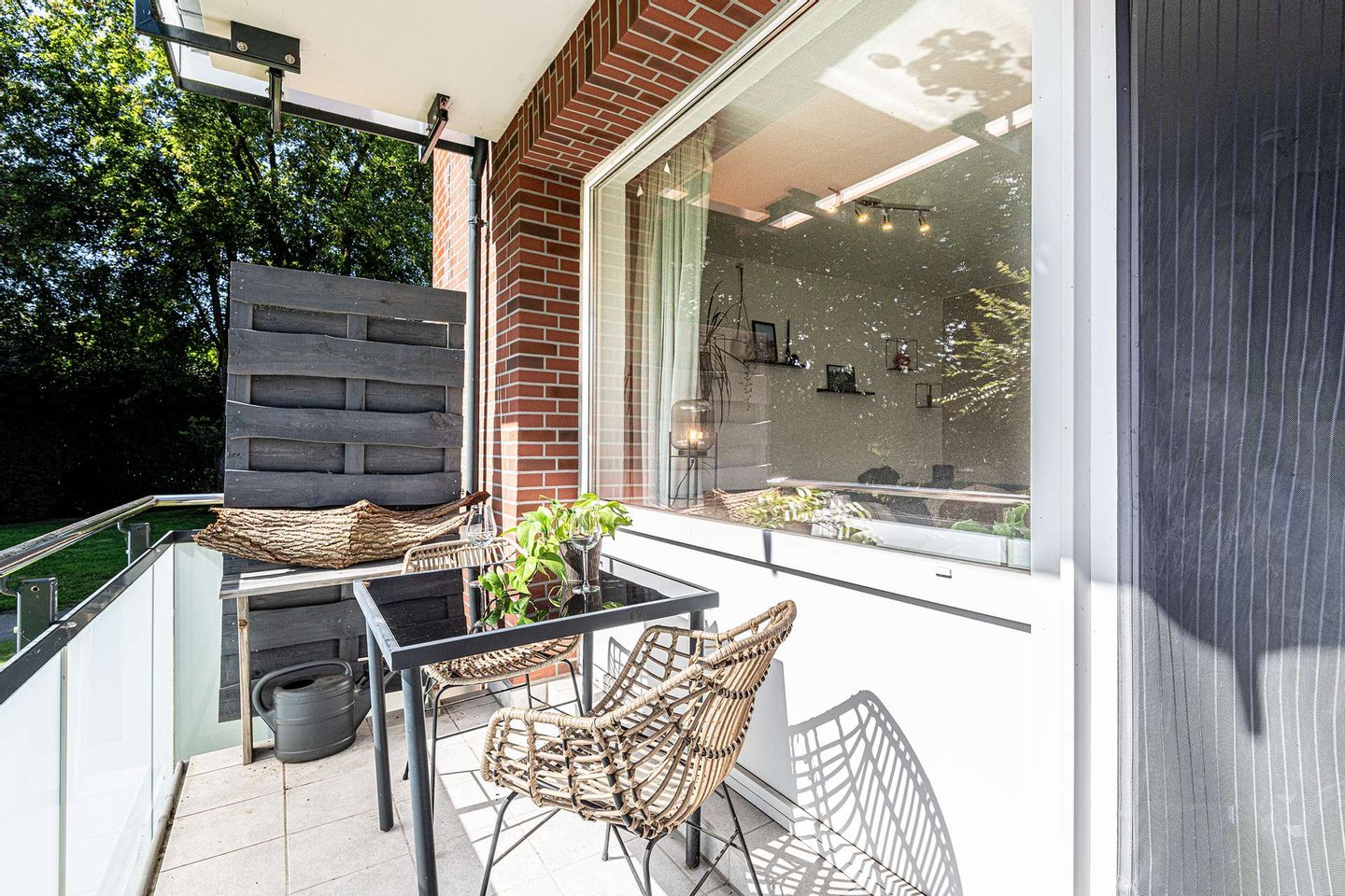 Der Grundriss und Zugang an die frische Luft bietet nämlich sämtlichen Komfort, den man sich wünschen kann. Ob bei Regen gemütlich auf der Couch sitzen oder bei Sonnenschein den Kaffee im Freien genießen, hier ist für jeden etwas dabei.