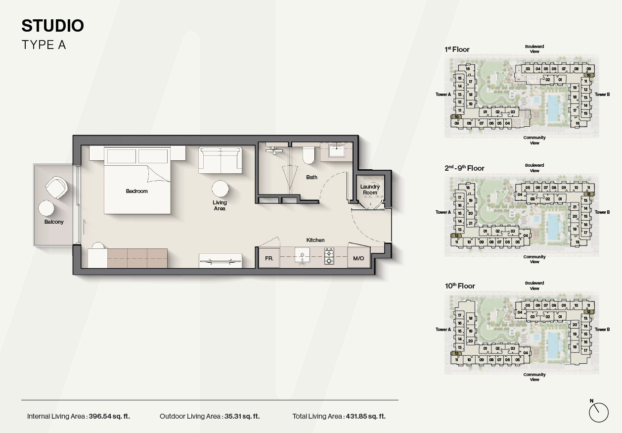 Willkommen zu Ihrer Besichtigung dieser traumhaften Studio-Wohnung. Von diesem Zuhause aus haben Sie Zugang zu einem Resort-style Swimmingpool, in dem Sie sich an heißen Tagen erfrischen können. Für die kleinen Badebegeisterten gibt es zudem einen Kinderpool mit Schattenbereich. Auf der 41.000 qm großen, landschaftlich gestalteten Terrasse erwarten Sie wunderschöne Gärten und gemütliche Cabanas.
