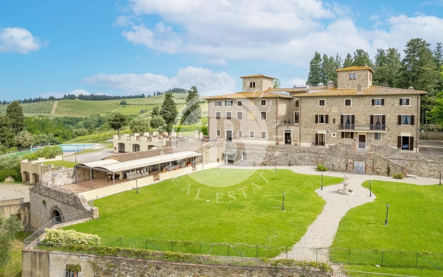 Eingebettet in eine wirklich einzigartige Umgebung, erstreckt sich das Anwesen über ca. 6 Hektar, darunter ein produktiver Olivenhain von über 5 Hektar und ein raffinierter 1.200 m² großer Garten im italienischen Stil. Drei Panorama-Swimmingpools, die harmonisch in die Landschaft integriert sind, bieten ultimativen Komfort und Entspannung mit herrlichem Blick auf das Chianti-Tal und die Türme von San Gimignano. Eine Panoramaterrasse und mehrere Außenbereiche machen diese Immobilie ideal für private Veranstaltungen, Empfänge oder ruhige Kontemplation inmitten der Natur.