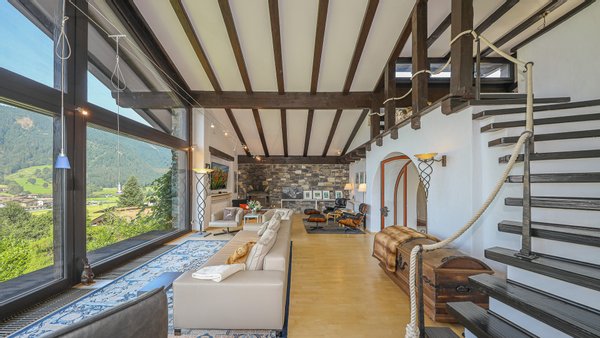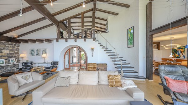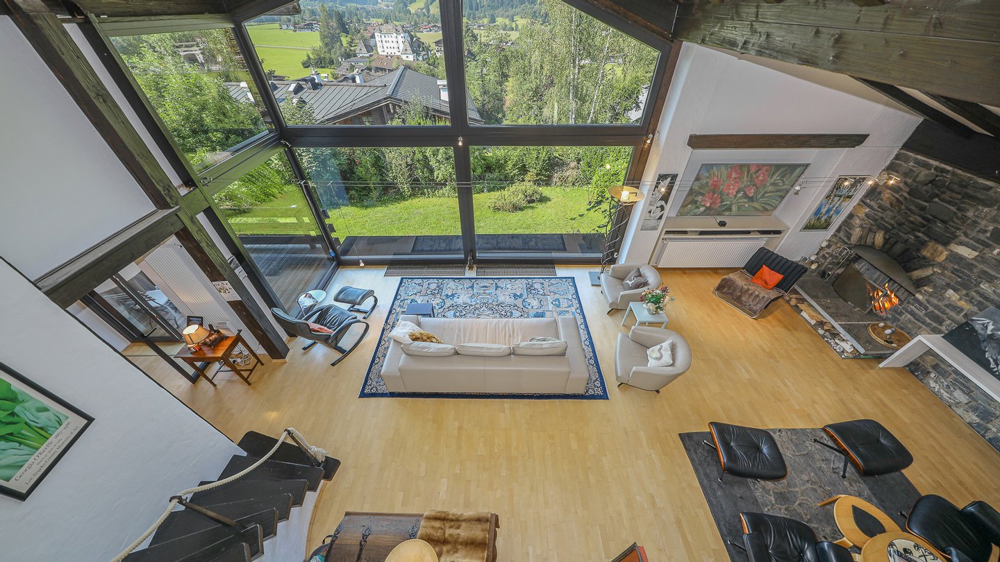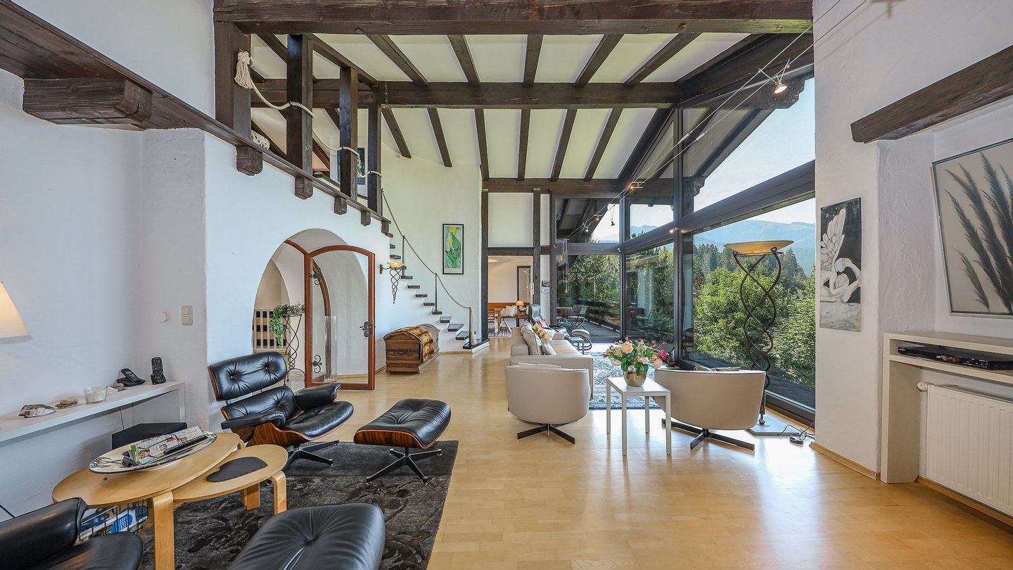 Man betritt das Landhaus im Obergeschoss und gelangt in ein großzügiges Entrée. Diese Ebene teilt sich in einen lichtdurchfluteten Wohnbereich mit offenem Sicht-Dachstuhl und großen Panorama-Fenstern, durch welche man die grandiose Aussicht bestaunen kann. Von hier hat man eine fantastische Aussicht auf die umliegende Bergwelt.
