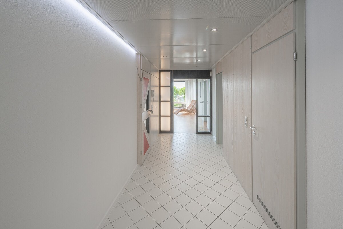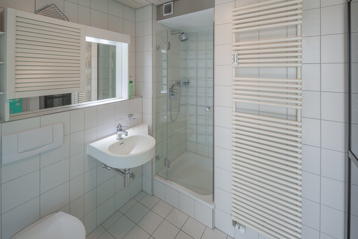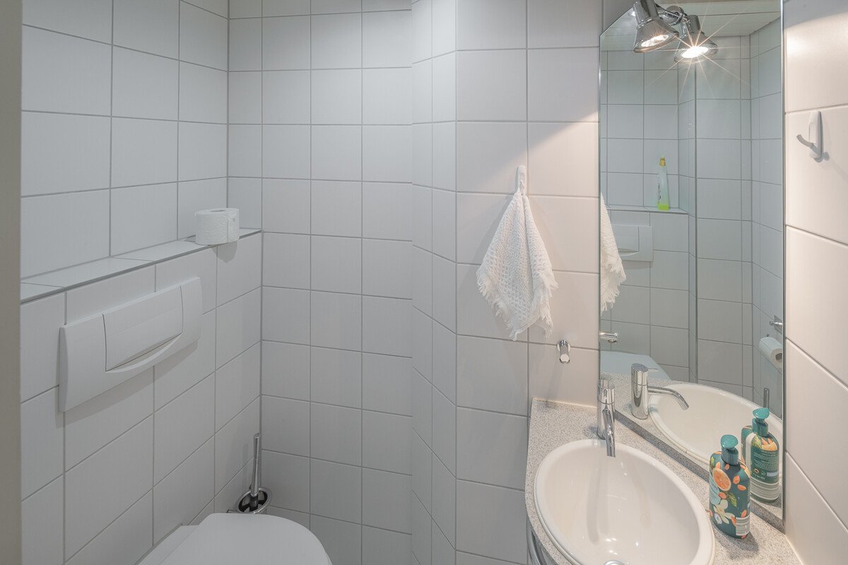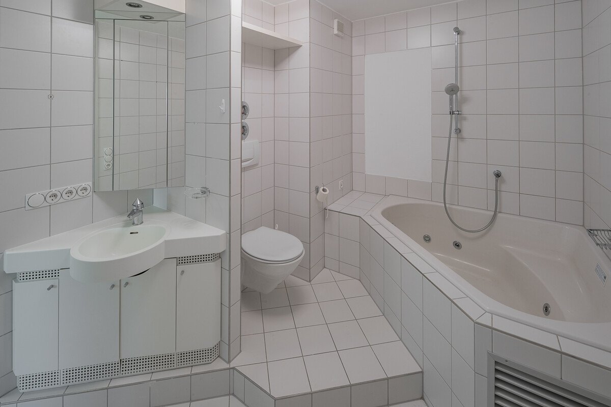 Das Penthouse verfügt über zwei moderne Bäder mit einer Eckbadewanne sowie ein zusätzliches, separates Gäste-WC. Ein großer, gemauerter Kellerraum mit Hobbyraumcharakter (24 m²) bietet zusätzlichen Stauraum und vielseitige Nutzungsmöglichkeiten.