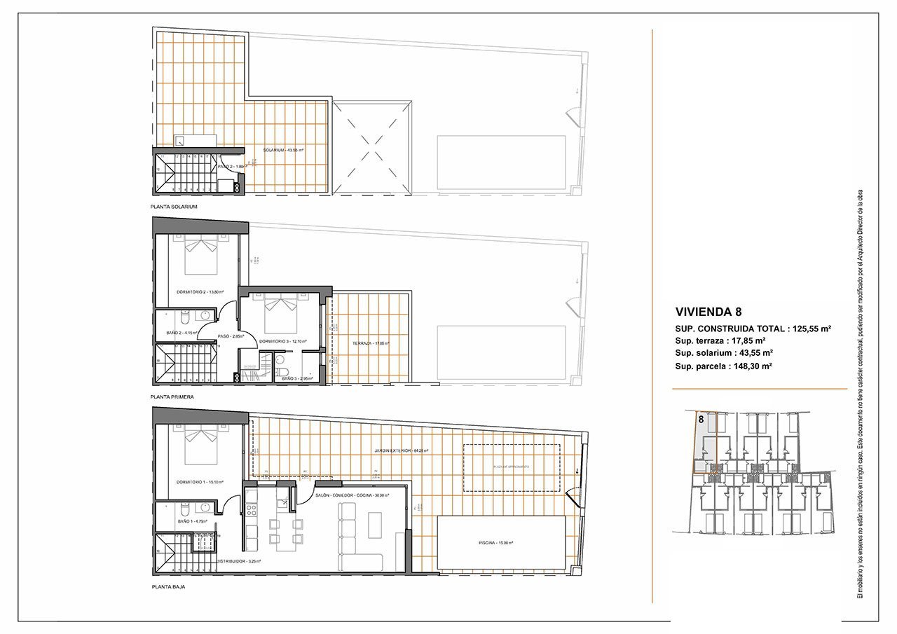 Reihenhaus-Villen mit 3 Schlafzimmern, 3 Bädern, Dachterrasse, Küchen mit Elektrogeräten, Privatpool und Kfz-Stellplatz nur 1,3 km vom Strand