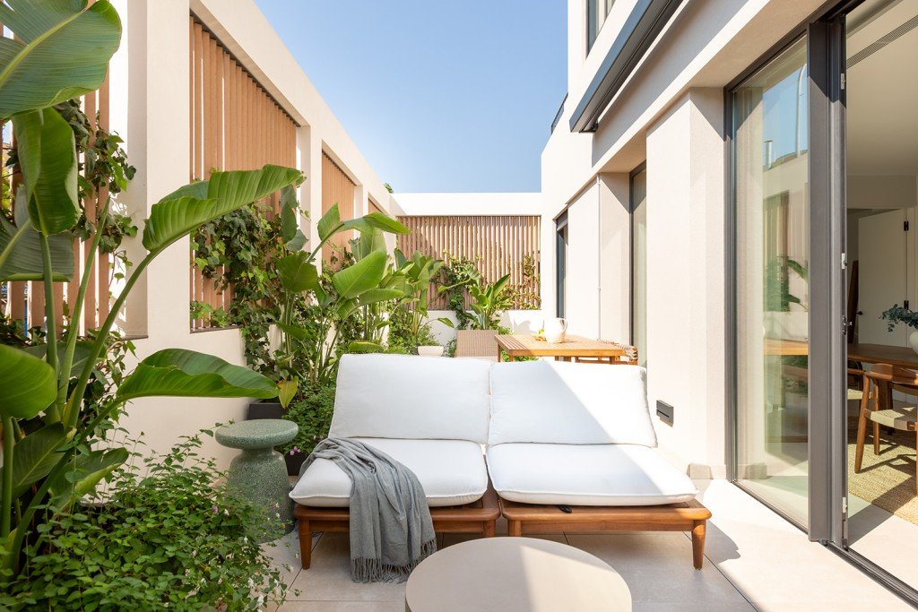 Der Innenbereich erstreckt sich über 106 m² und wurde durchdacht gestaltet, mit einer offenen Küche mit einer eleganten Kochinsel und hochwertigen Miele-Geräten, die nahtlos in den Wohnbereich übergeht. Beide Schlafzimmer sind hell und geräumig, wobei die Master-Suite direkt auf die Terrasse hinausgeht und über ein elegantes Bad verfügt. Die beiden Badezimmer sind mit glasverkleideten Duschen, Ambientebeleuchtung, Waschbecken aus Mineralwerkstoff mit viel Stauraum und runden LED-Spiegeln ausgestattet, die Funktionalität mit modernem Design verbinden. Die Immobilie wird komplett möbliert verkauft.