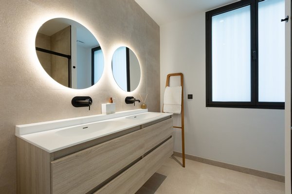 Praktische Details sind ebenso gut integriert, darunter Einbauschränke, ein separater Hauswirtschaftsraum mit Waschmaschine und Trockner sowie ein 13 m² großer Kellerraum, der für hervorragende Ordnung sorgt. Fußbodenheizung und Klimaanlage sorgen für ganzjährigen Komfort, während Porcelanosa-Fliesen in Steinoptik und indirekte Beleuchtung für Raffinesse sorgen. Parkplätze stehen im selben Gebäude zur Verfügung und bieten zusätzlichen Komfort.