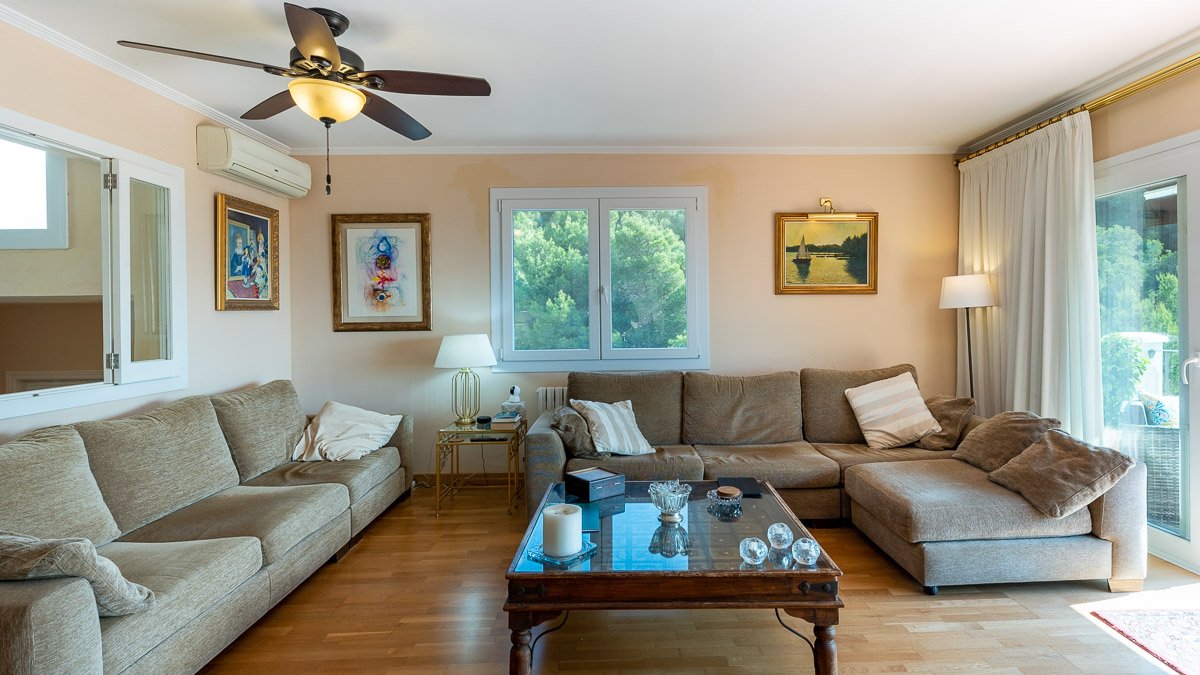 Dieses traditionelle Einfamilienhaus in den Hügeln von Costa d`en Blanes bietet neben dem nach Südosten ausgerichteten Meerblick einen ruhigen privaten Poolbereich auf der Rückseite des Grundstücks. Das Innere der 267 m2 bebauten Fläche bietet einen