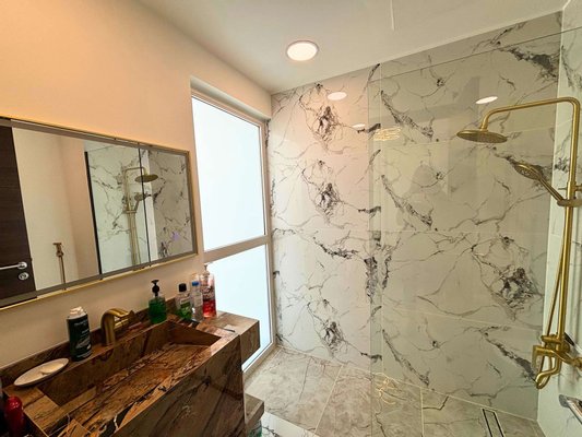 Durch die Glasschiebetüren gelangen Sie in den umgebauten Garten zur Terrasse, der perfekt ist für entspannte Grillabende im Freien. Die Dachterrasse bietet eine idyllische Aussicht und ist der ideale Ort, um die Sonnenuntergänge zu genießen. Im Obergeschoss befinden sich die drei Schlafzimmer, jedes mit eigenem Badezimmer. Ein Badezimmer wurde sogar zu einem begehbaren Kleiderschrank umgebaut, der viel Platz für Ihre Garderobe bietet.