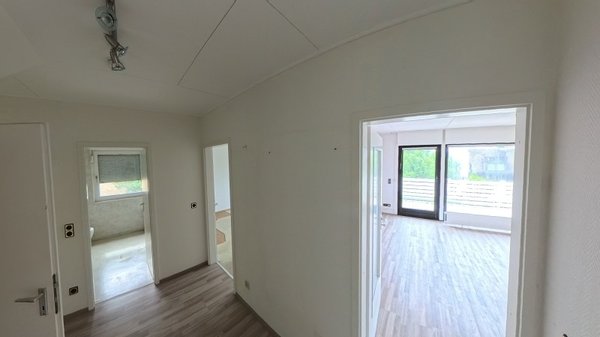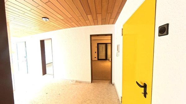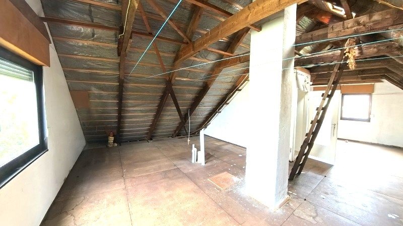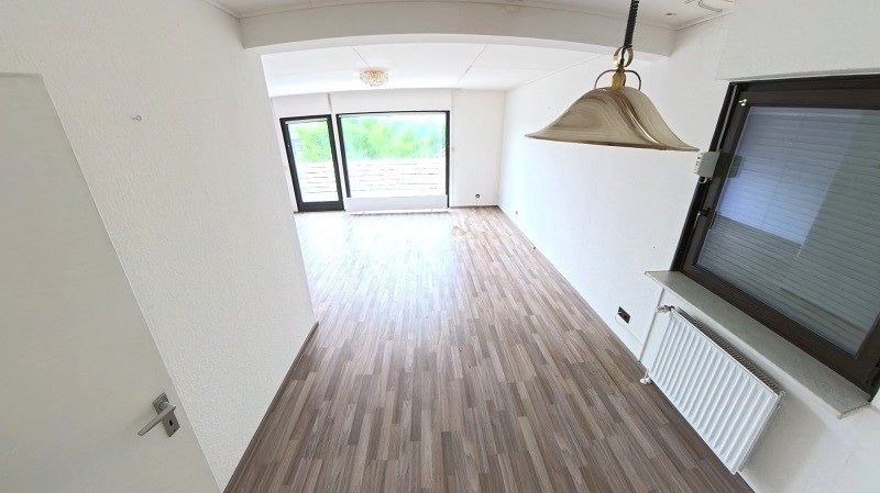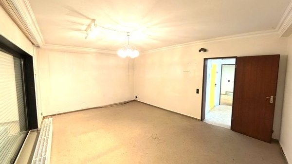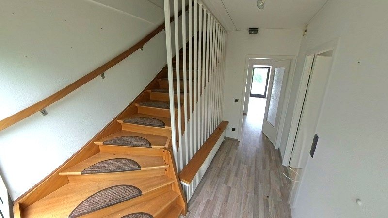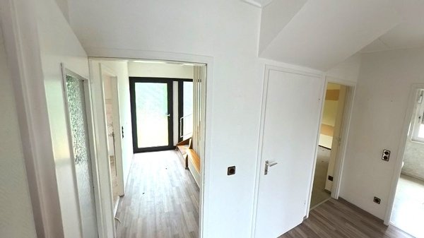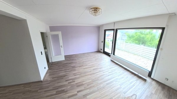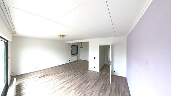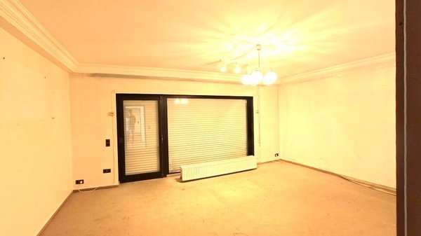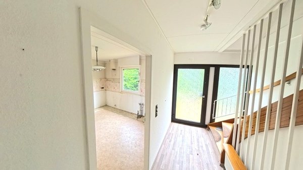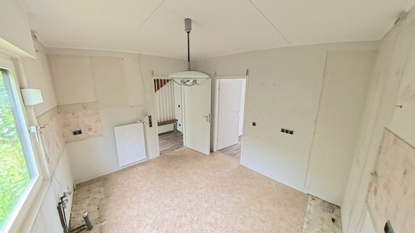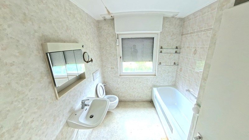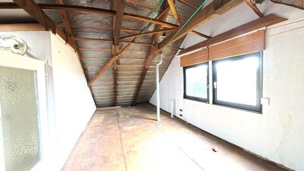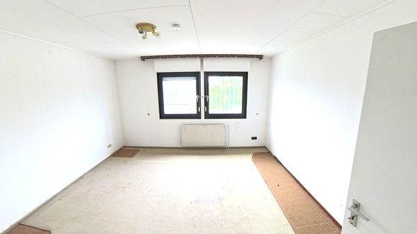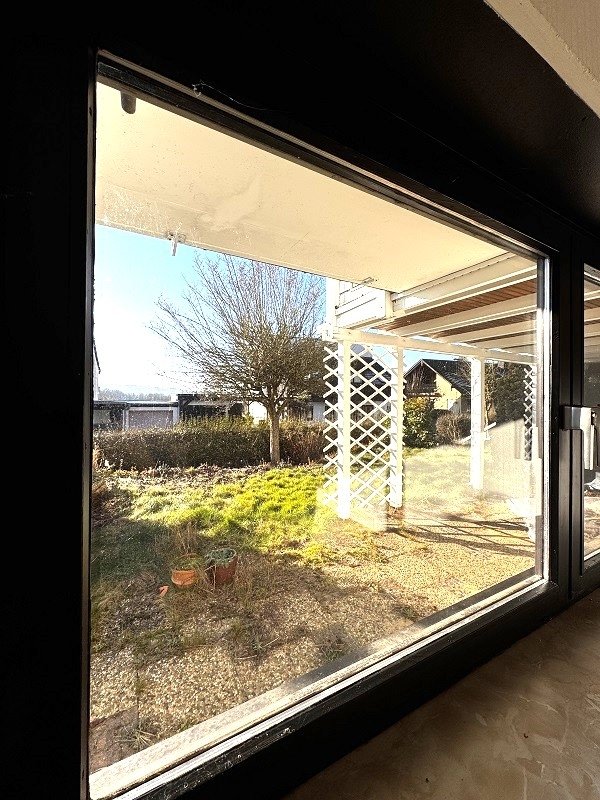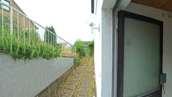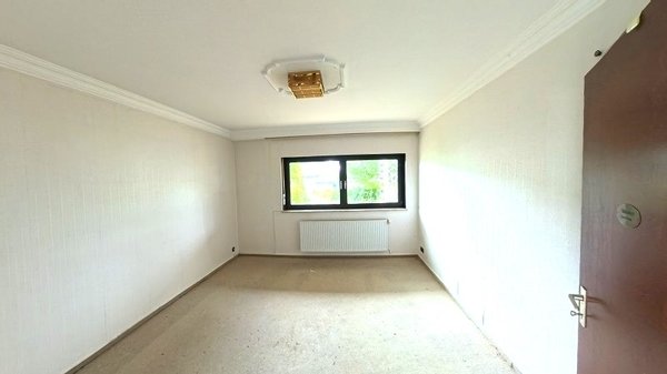 Das Bestandshaus hat einen massiv gebautes Souterrain, welches durch die Hanglage auf der Vorderseite ebenerdig ist (mit Ausgang auf die Terrasse). Dieses ist durch einen separaten Eingang als Einliegerwohnung nutzbar oder als weitere Wohnebene. Beide Zimmer nach vorne sind klassische EG-Zimmer und entsprechend hell (Foto des Souterrain-Wohnzimmer mit geschlossener Jalousie. da Jalousie ausgehändigt). Das bisherige Wohngeschoß (mit großem Balkon / Terrasse) und Dachgeschoß (bisher nicht ausgebaut) sind in Fertigbauweise im Jahr 1975 errichtet. Das Haus befindet sich zur Zeit in einem unbewohnten, renovierungsbedürftigen Zustand.