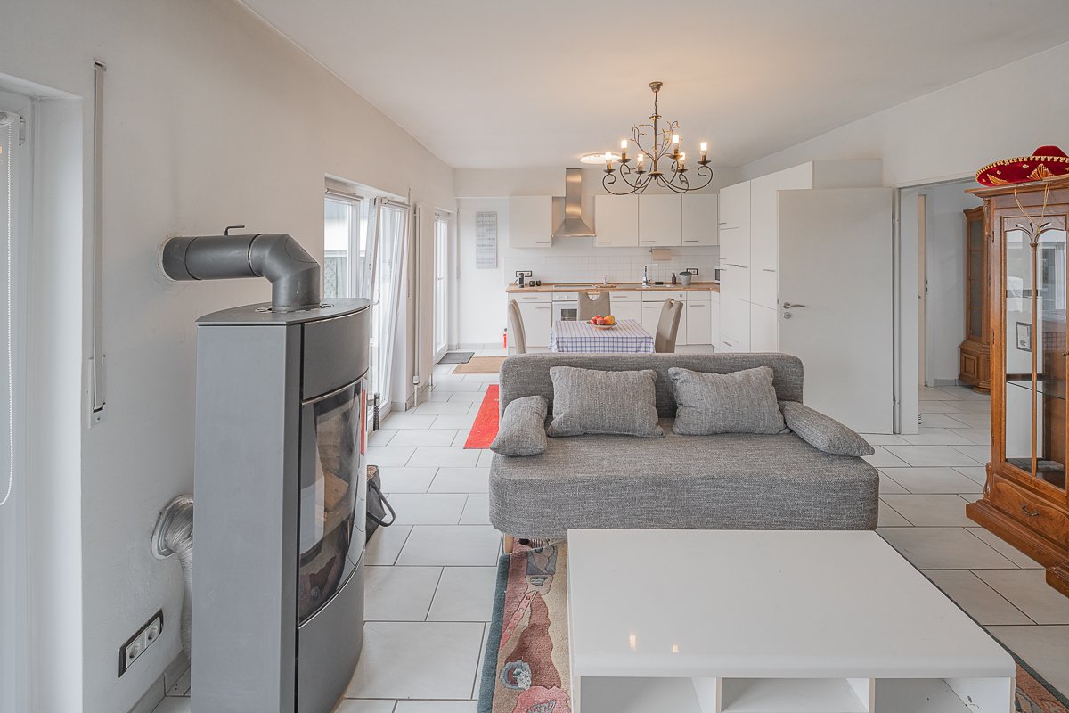 Im linken Teil des Erdgeschosses erwartet Sie ein großes Wohnzimmer, eine geräumige Wohnküche mit Essplatz, ein weiteres Zimmer sowie ein Badezimmer mit Fußbodenheizung, Dusche und Wanne.