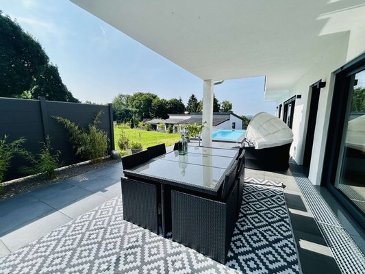 Der großzügige Wohn- und Essbereich besticht durch eine hochmoderne Einbauküche. All dies schließt direkt an den beheizbaren Außenpool und die geräumige teils überdachte Terrasse an. Hier können Sie gemütliche Abende vor dem Kamin verbringen und den Blick ins Grüne genießen. Dank der intelligenten Raumaufteilung eignet sich das Haus perfekt für Familien oder Paare, die Wert auf ein stilvolles und komfortables Zuhause legen.