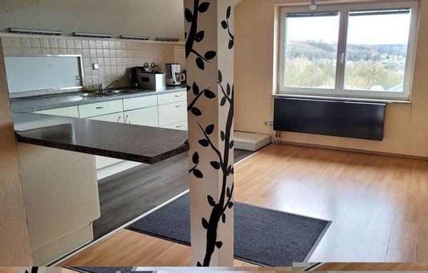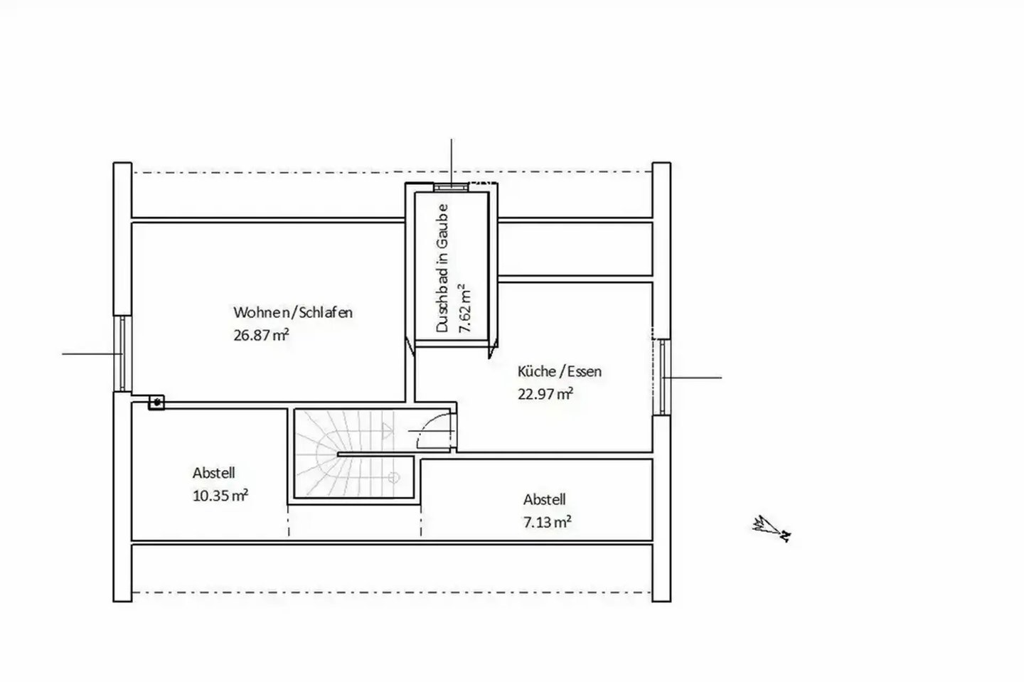 Die Einliegerwohnung umfasst einen kombinierten Wohn- und Schlafbereich, eine Küche mit Essplatz, ein Badezimmer sowie zwei praktische Abstellräume.