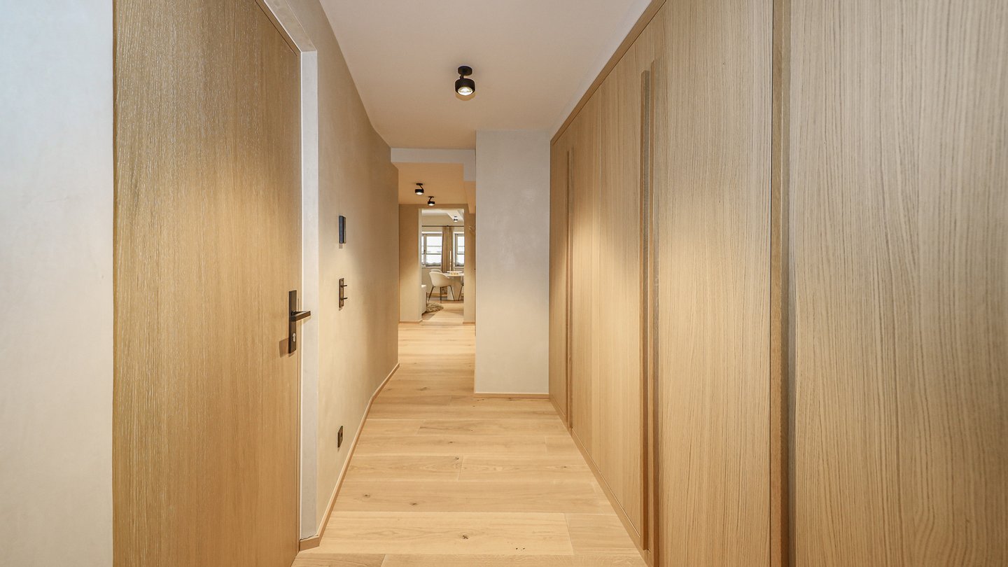 Die 2023 hochwertigst generalsanierte Wohnung misst ca. 104. m² und teilt sich auf in einen geräumigen Eingangsbereich mit Garderobe und zahlreichen Einbauschränken, den großzügigen Wohn- und Essbereich mit Kamin und angrenzender Designerküche, ausgestattet mit allen Geräten der Marken Bora, Miele und Siemens.