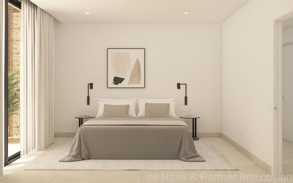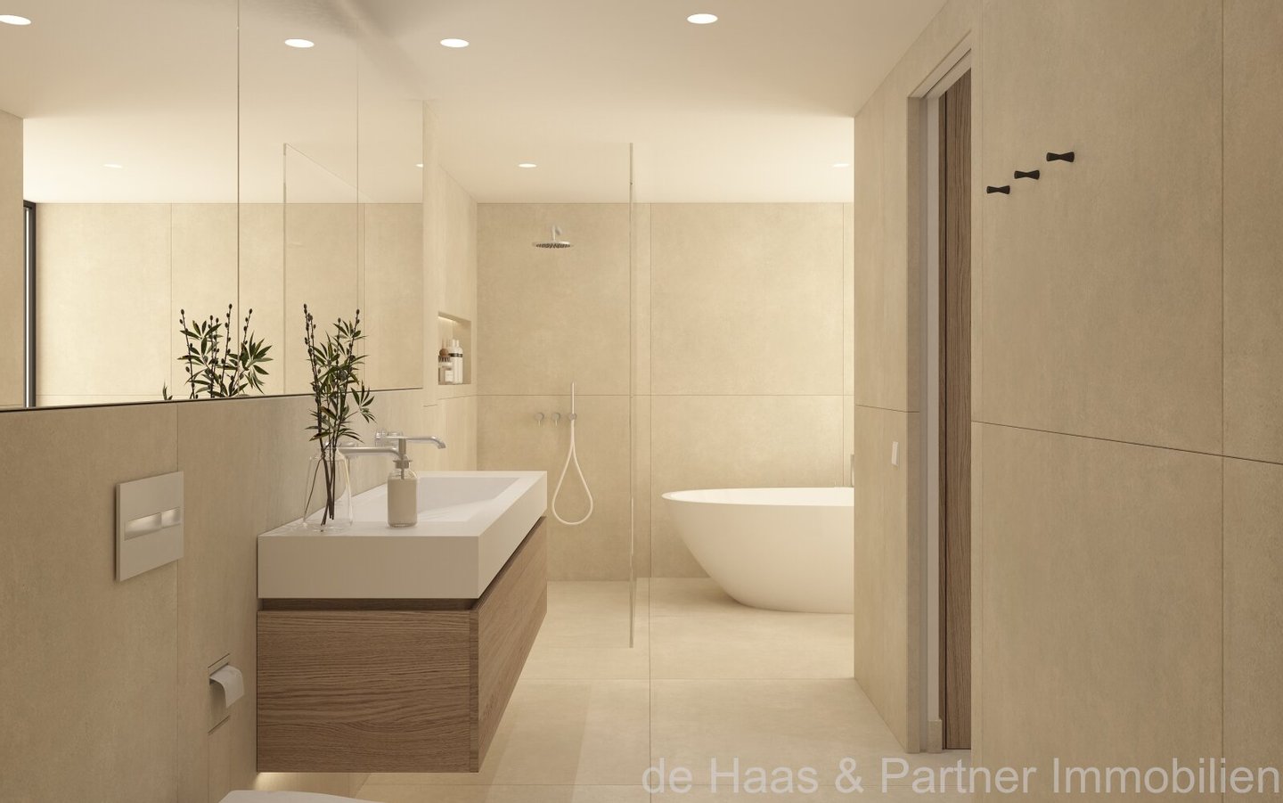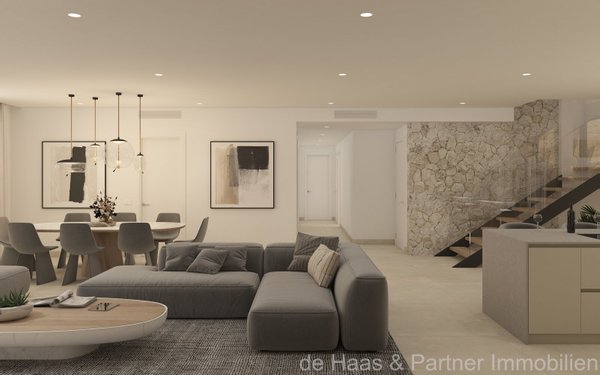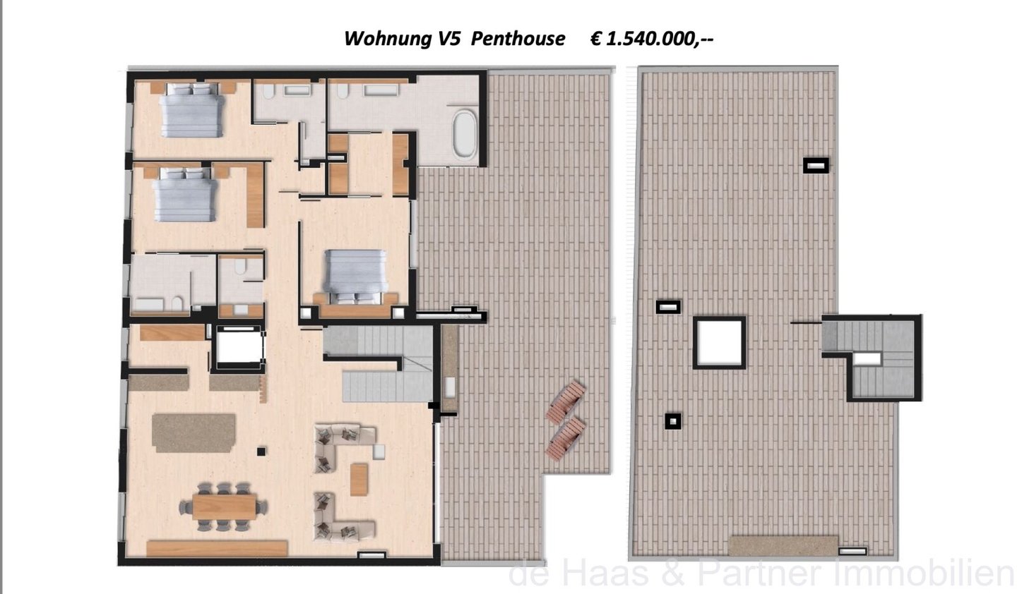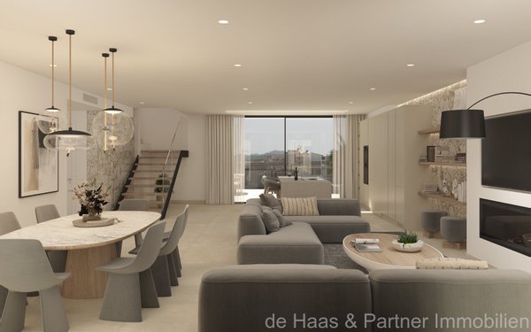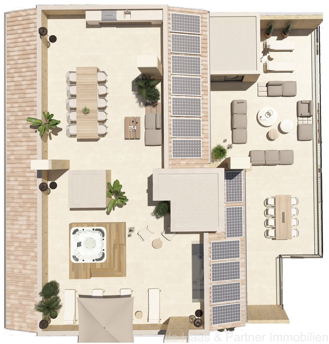 Wohn-/Esszimmer mit Zugang zu beiden Terrassen (264m² ), die über eine innenliegende Treppe erreicht werden, offene Küche, Hauswirtschaftsraum, 3 Schlafzimmer, 3 Badezimmer (alle en suite), 1 Gäste WC, Flur, des weiteren ist ein im Erdgeschoss befindlicher Stellplatz sowie ein Abstellraum im Kaufpreis inklusive.
