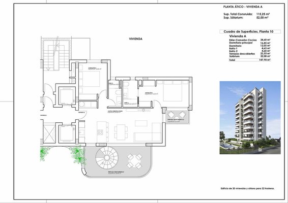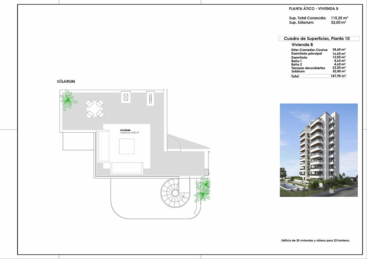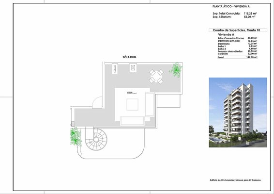 Das moderne Gebäude wird aus nur 20 Wohnungen mit je 2 Schlafzimmern und 2 Bädern und mit großzügigen Terrassen, Tiefgaragenplatz und privatem Abstellraum bestehen. Es gibt 10 Etagen und auf der obersten Etage liegen die Penthouse-Wohnungen mit Terrasse und privater Dachterrasse. Selbstverständlich wird es auch einen Gemeinschaftspool und sehr schöne Gemeinschaftsanlagen geben.