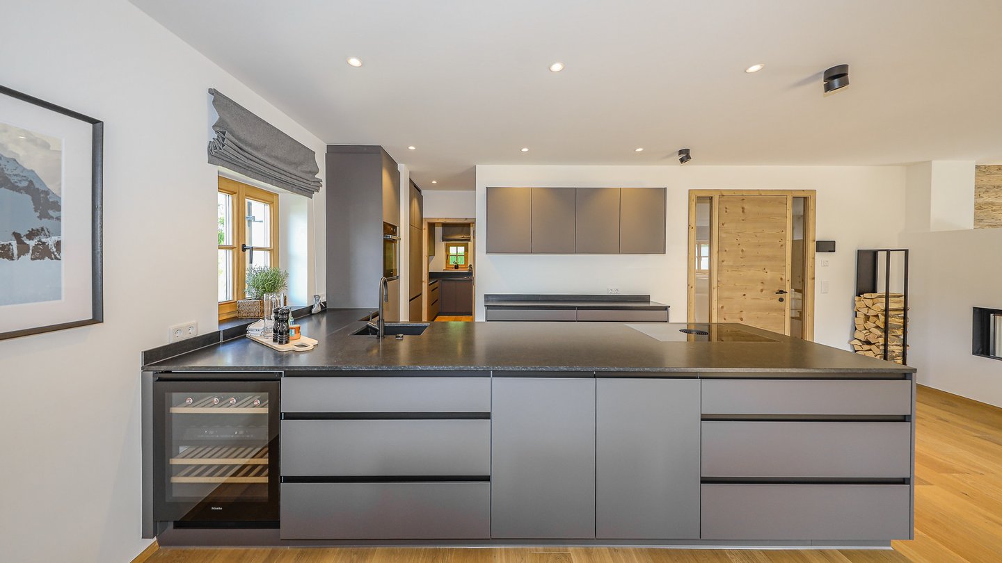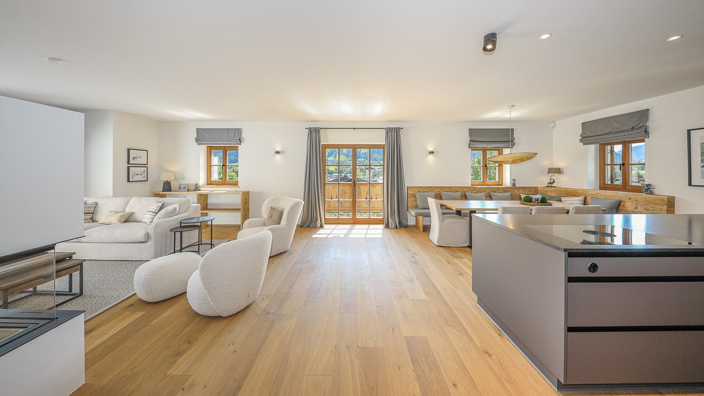 Dieser erstreckt sich über ca. 60 m² und beinhaltet eine Designerküche mit dahinter gelegener Vorbereitungsküche, einen großzügigen Essbereich sowie den gemütlichen Wohnbereich mit Kamin. Vom Wohnbereich kommt man auf einen Balkon und eine große Terrasse, von welchen man die grandiose Aussicht auf die Stadt Kitzbühel und den Hahnenkamm genießen kann.