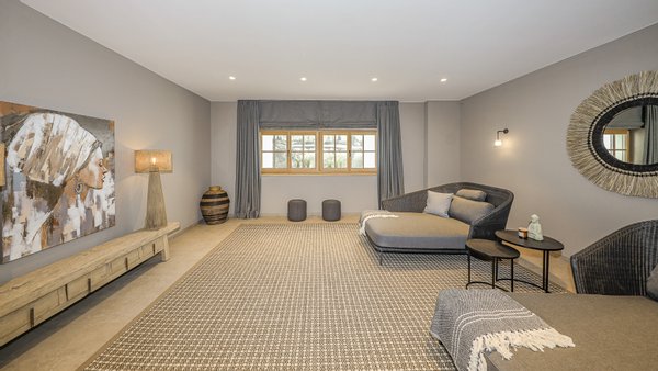Im unteren Trakt der Neubauvilla ist der große Wellnessbereich mit Ruheraum, Sauna, Dusche und WC situiert.