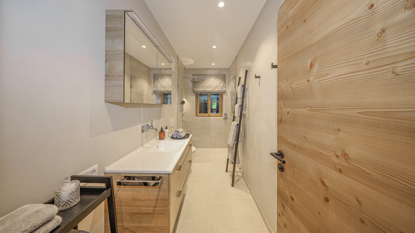Im Dachgeschoss mit schöner Altholz-Dachstuhluntersicht befindet sich der 30 m² große Masterbedroom mit Ankleide und Bad en Suite sowie ein weiteres komfortables Schlafzimmer mit Ankleide und Bad en Suite.