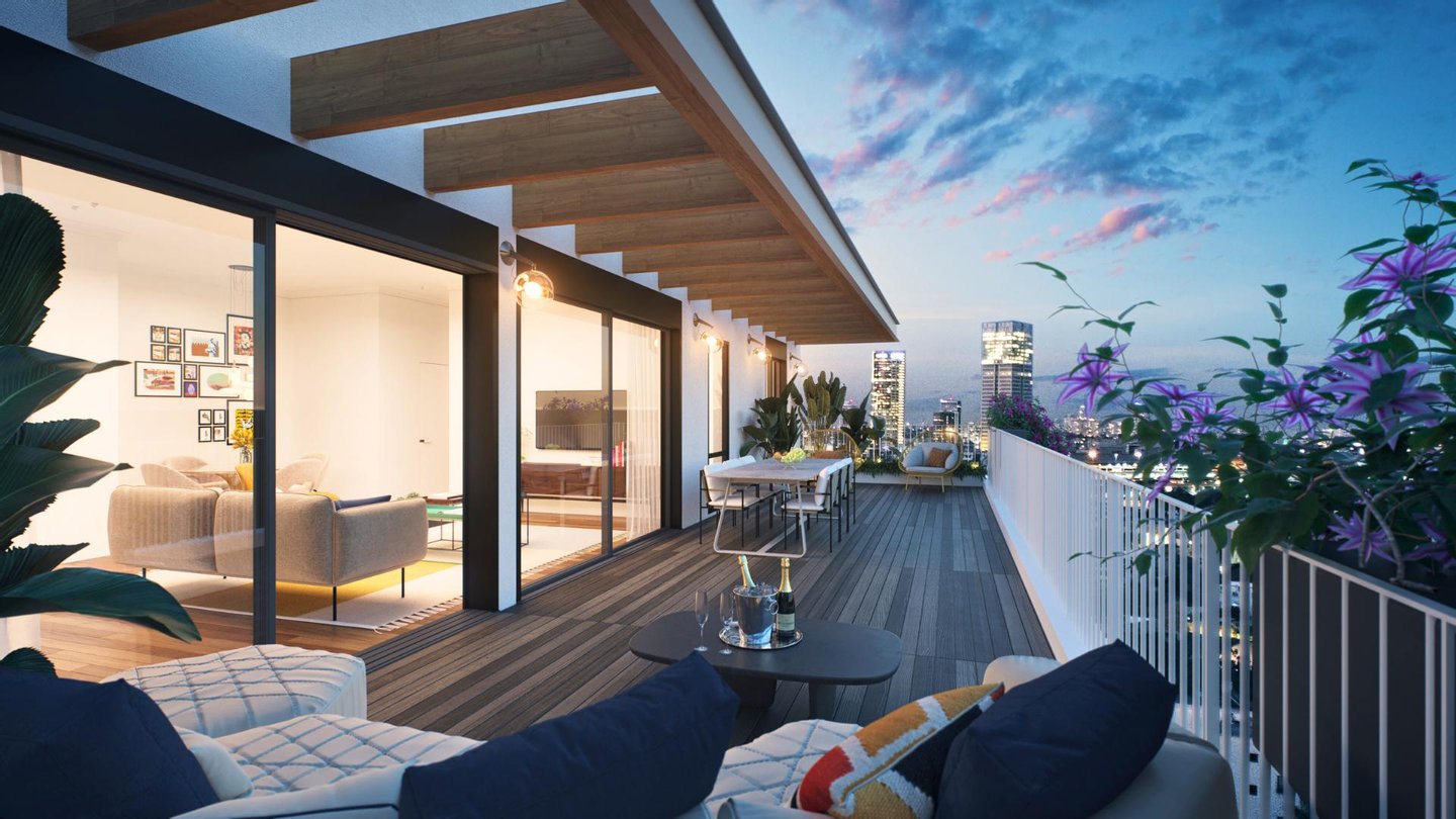 Das vom renommierten Architekten Ilan Pivko entworfene Gebäude verfügt über eine moderne Fassade, durchgehende Terrassen und charakteristische dekorative Fensterläden, die Privatsphäre und optimale Tageslichtlenkung bieten. Die intelligente, detailverliebte Innenraumaufteilung maximiert sowohl den Komfort als auch die Funktionalität.