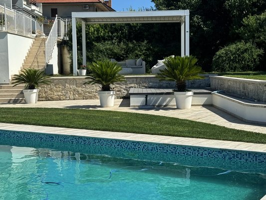 - Eleganter Poolbereich, harmonisch in den gepflegten Garten eingebettet – ideal zum Entspannen.