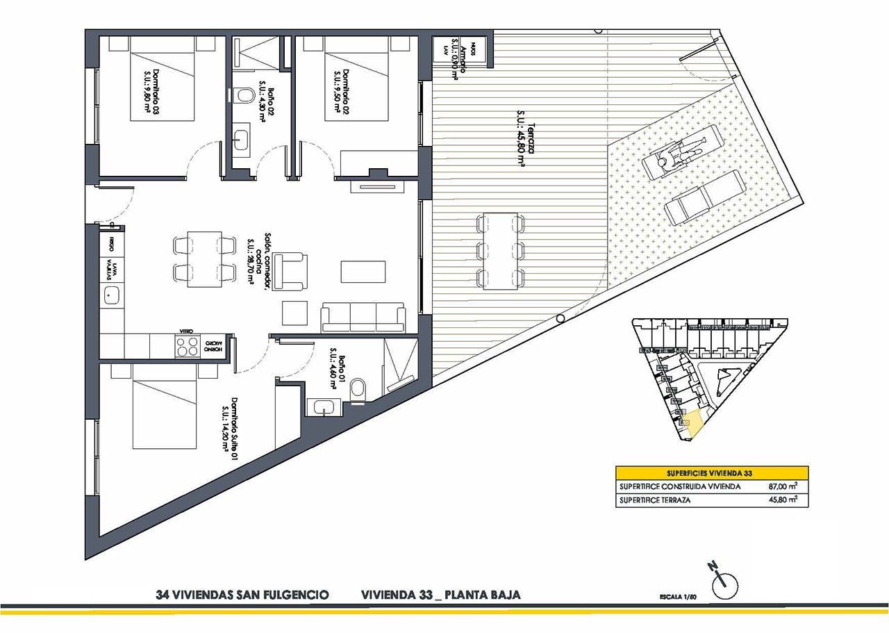 In dieser kleinen Anlage entstehend 34 Wohnungen mit 2 oder 3 Schlafzimmern, 2 Bädern, großzügigen Terrassen und privaten Kfz-Stellplätzen. Und selbstverständlich verfügt die Anlage über eine sehr schöne Grünzone mit Gemeinschaftspool.