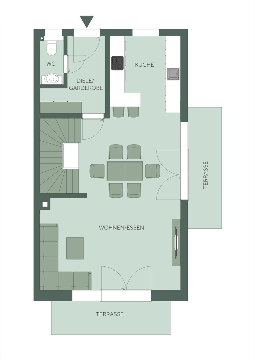 Der Grundriss überzeugt durch einen großzügigen Wohn- und Essbereich mit offener Küche. Von hier gelangt man auf die nach Südosten ausgerichtete Terrasse mit eigenem Gartenanteil – ein idealer Platz zum Entspannen.