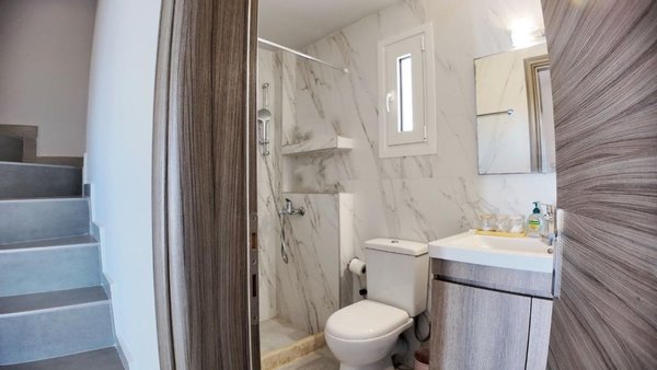 Das Haupthaus erstreckt sich über zwei Ebenen. Im Erdgeschoss befindet sich ein großer offener Raum mit Küche - Esszimmer - Wohnzimmer und einem Badezimmer. Im ersten Stock erreichen Sie über eine Innentreppe zwei Schlafzimmer und ein Badezimmer, während sich im zweiten Stock des Hauses ein weiteres Schlafzimmer mit WC befindet.