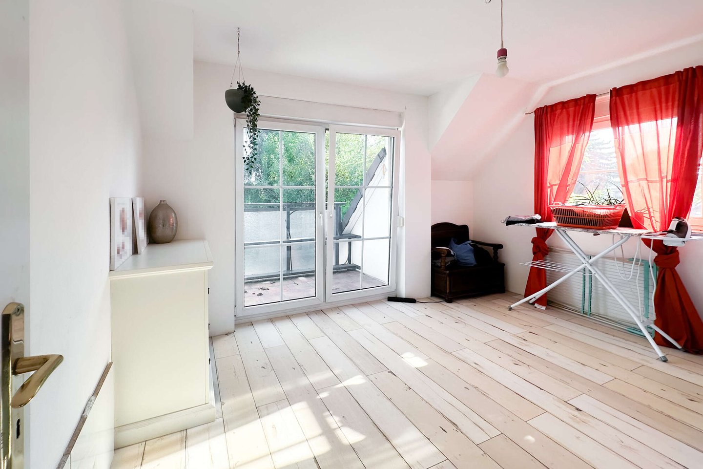 Im Obergeschoss erwarten Sie ein geräumiges Schlafzimmer mit kleinem Arbeitsbereich, drei weitere Zimmer, eines davon mit Balkon, welcher einen wunderschönen Blick über den Garten offeriert, sowie der Zugang zum Dachboden mit zusätzlicher Abstellfläche. Abgerundet wird die Etage durch ein großes Wannenbad.