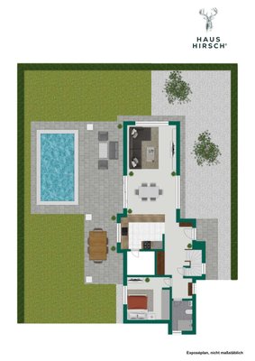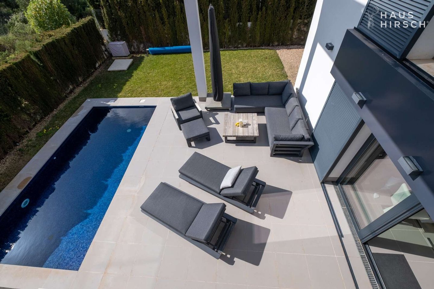 Der Außenbereich wurde als private Wellness-Oase konzipiert. Hier erwartet Sie ein herrlicher Pool, der dank einer effizienten Luft-Wärmepumpe nicht nur an heißen Sommertagen für Erfrischung sorgt, sondern auch im Winter zum Entspannen einlädt. Die angrenzende Terrasse ist mit besonders widerstandsfähigen und zugleich stilvollen Design-Möbeln der Marke Life ausgestattet, die gemeinsam mit einem großzügigen Sonnenschirm den perfekten Rahmen für das Leben im Freien bilden.