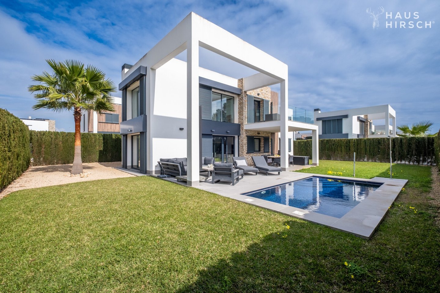 Zusätzlich zum privaten Luxus bietet die Anlage einen 80 m² großen Gemeinschaftspool, der das ganze Jahr über genutzt werden kann und ausreichend Platz für sportliche Schwimmeinheiten bietet. Diese Villa wird komplett möbliert angeboten und ermöglicht Ihnen ein vollkommen unbeschwertes Ankommen: Einfach aufschließen, einziehen und den Luxus in einer idyllischen Umgebung in vollen Zügen genießen.