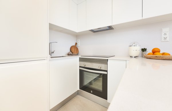 Die Küche ist mit Ober- und Unterschränken mit laminierten Fronten in Weiß und die Arbeitsplatte der Marke Silestone ist ebenfalls weiß. Darüber hinaus gehören ein Induktionskochfeld, Backofen und Edelstahldunstabzugshaube zur Ausstattung.