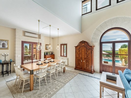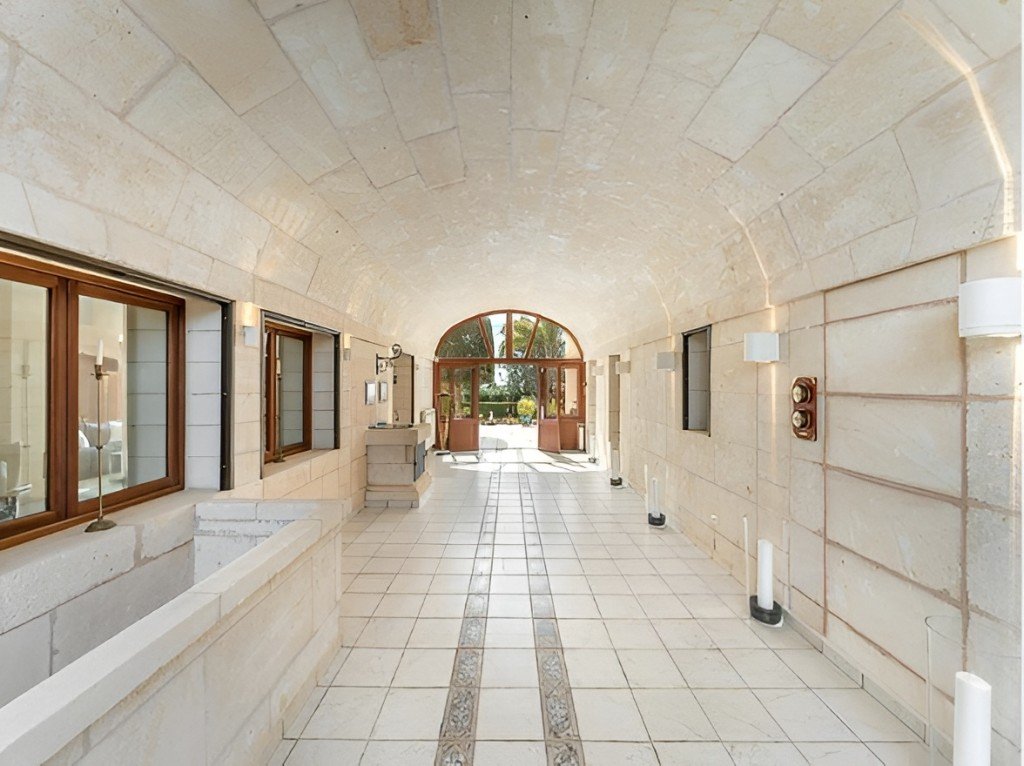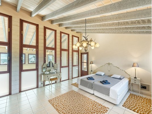 Im Obergeschoss befinden sich zwei großzügige Schlafzimmer, eines davon mit privater Terrasse, ideal für die Morgensonne. Ein helles Atrium verbindet das Haupthaus mit dem Gästehaus, das vier weitere Schlafzimmer bietet. Eines davon verfügt über eine kleine Küchenzeile und eignet sich perfekt als Gästestudio.