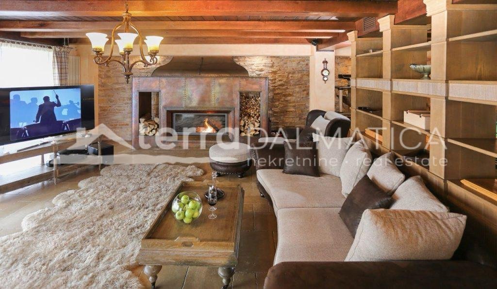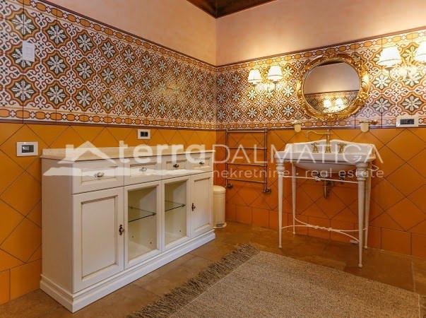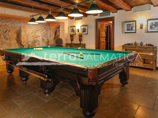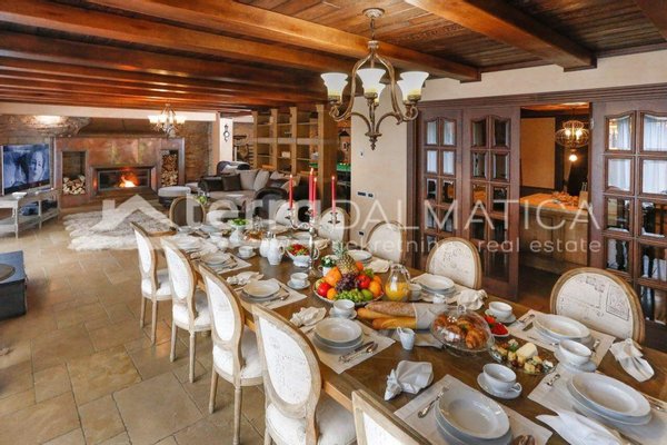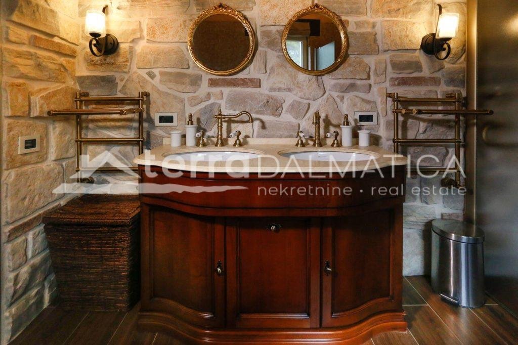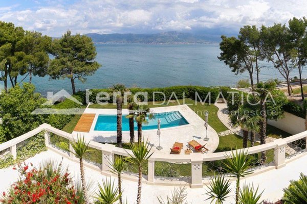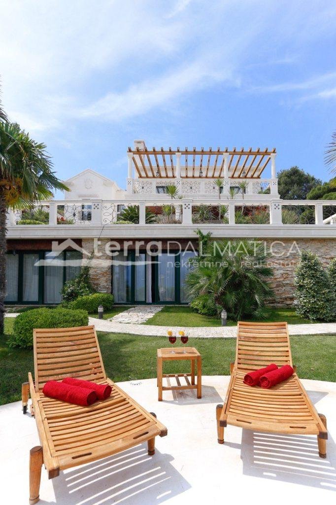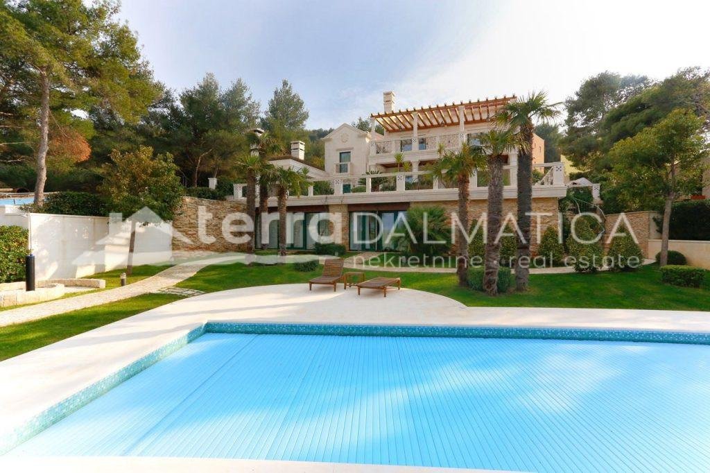 In einer einzigartigen Lage in Čiovo, nur zehn Meter vom Meer entfernt, steht eine luxuriöse Villa mit einer beeindruckenden Wohnfläche von 980 m² zum Verkauf, die sich auf einem Grundstück von 1370 m² befindet und aus dem berühmten Brač-Stein erbaut wurde, der ihr einen zeitlosen Charme und Eleganz verleiht. Die Villa erstreckt sich über drei Etagen und ist so konzipiert, dass sie die perfekte Balance zwischen Luxus, Komfort und absoluter Privatsphäre bietet. Im Erdgeschoss befinden sich eine geräumige Garage für drei Autos, eine Waschküche, eine Garderobe und ein Weinzimmer, während der Wohnbereich aus einer Küche mit Esszimmer und einem großen Wohnzimmer mit Zugang zur Terrasse besteht, neben dem sich eine Spa-Oase mit Innenpool und russischer Sauna befindet. Auf der gleichen Etage befindet sich auch ein Schlafzimmer mit eigenem Bad und einer privaten Terrasse. Im ersten Stock befindet sich eine zusätzliche Küche mit Esszimmer und Wohnzimmer, eine große Terrasse mit Platz zum geselligen Beisammensein und Genießen des Meerblicks sowie ein Schlafzimmer mit eigenem Bad. Die zweite Etage ist eine echte Wohngegend mit einem geräumigen Hauptschlafzimmer, einem luxuriös ausgestatteten Badezimmer und einer privaten Terrasse, während sich daneben zwei weitere Schlafzimmer mit jeweils eigenem Bad und eine große Terrasse mit einem faszinierenden Panoramablick auf das Meer und die umliegenden Inseln befinden. Die Villa bietet auch eine komplett separate Wohnung mit separatem Eingang, ideal für Gäste oder Personal, bestehend aus einer Küche mit Wohnzimmer, einem Schlafzimmer und einem Badezimmer. Das Äußere der Villa ist ebenso beeindruckend – ein sorgfältig gestalteter mediterraner Garten, der mit einheimischen Pflanzen angereichert ist, sorgt für Intimität und Ruhe, während ein beheizter Außenpool und eine großzügige Liegewiese dazu einladen, den mediterranen Lebensstil in vollen Zügen zu genießen. Neben einer luxuriösen Ausstattung wie Zentralheizung, Sonnenkollektoren, einem Videoüberwachungssystem und einem ausgeklügelten Luft- und Wasserreinigungssystem bietet die Villa auch drei Außenstellplätze und eine Garage für drei Fahrzeuge. Die Lage ist perfekt für diejenigen, die Exklusivität und Zugänglichkeit suchen - die historische Stadt Trogir ist nur 8 km Luftlinie entfernt und der internationale Flughafen Split ist nur 7 km entfernt, was diese Immobilie zur perfekten Mischung aus privatem Luxus und hervorragender Konnektivität macht. Diese Villa ist wirklich eine Rarität auf dem Markt – ein wertvolles Beispiel für Architektur und Design, das mit Glamour und Raffinesse das alltägliche Erlebnis eines mediterranen Paradieses vermittelt.