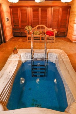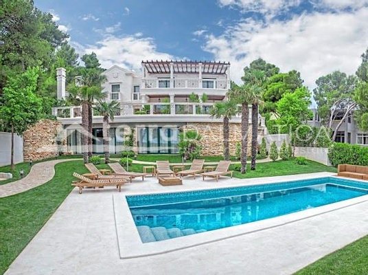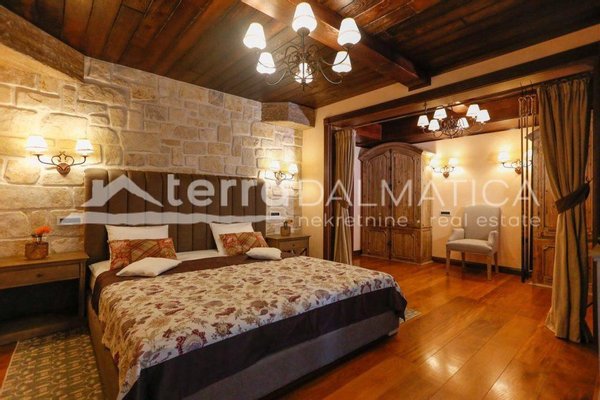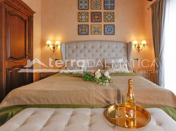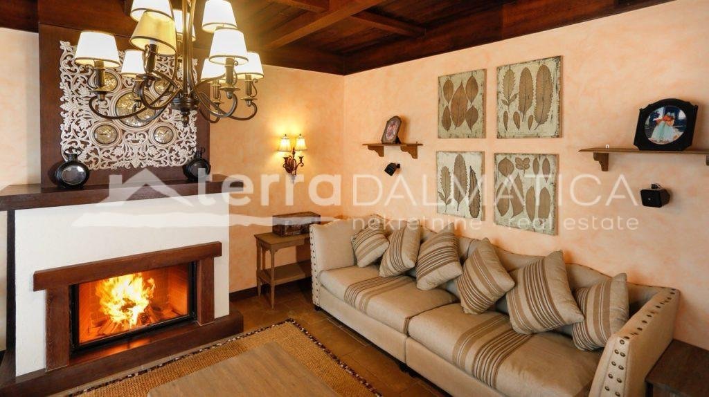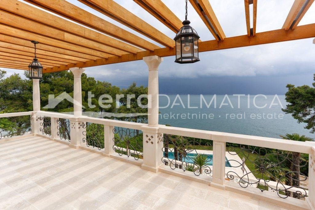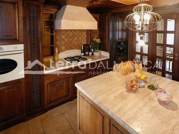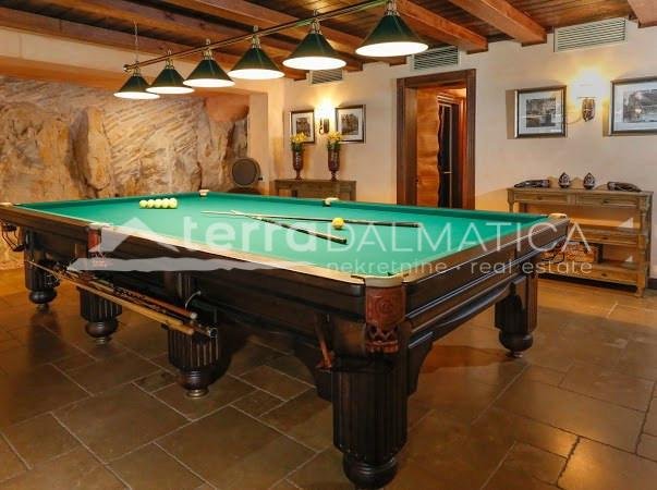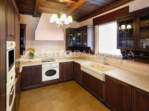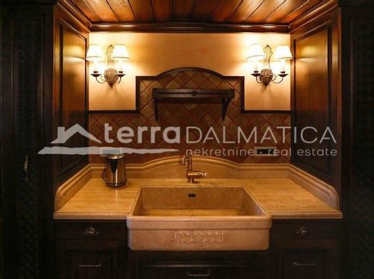 In einer einzigartigen Lage in Čiovo, nur zehn Meter vom Meer entfernt, steht eine luxuriöse Villa mit einer beeindruckenden Wohnfläche von 980 m² zum Verkauf, die sich auf einem Grundstück von 1370 m² befindet und aus dem berühmten Brač-Stein erbaut wurde, der ihr einen zeitlosen Charme und Eleganz verleiht. Die Villa erstreckt sich über drei Etagen und ist so konzipiert, dass sie die perfekte Balance zwischen Luxus, Komfort und absoluter Privatsphäre bietet. Im Erdgeschoss befinden sich eine geräumige Garage für drei Autos, eine Waschküche, eine Garderobe und ein Weinzimmer, während der Wohnbereich aus einer Küche mit Esszimmer und einem großen Wohnzimmer mit Zugang zur Terrasse besteht, neben dem sich eine Spa-Oase mit Innenpool und russischer Sauna befindet. Auf der gleichen Etage befindet sich auch ein Schlafzimmer mit eigenem Bad und einer privaten Terrasse. Im ersten Stock befindet sich eine zusätzliche Küche mit Esszimmer und Wohnzimmer, eine große Terrasse mit Platz zum geselligen Beisammensein und Genießen des Meerblicks sowie ein Schlafzimmer mit eigenem Bad. Die zweite Etage ist eine echte Wohngegend mit einem geräumigen Hauptschlafzimmer, einem luxuriös ausgestatteten Badezimmer und einer privaten Terrasse, während sich daneben zwei weitere Schlafzimmer mit jeweils eigenem Bad und eine große Terrasse mit einem faszinierenden Panoramablick auf das Meer und die umliegenden Inseln befinden. Die Villa bietet auch eine komplett separate Wohnung mit separatem Eingang, ideal für Gäste oder Personal, bestehend aus einer Küche mit Wohnzimmer, einem Schlafzimmer und einem Badezimmer. Das Äußere der Villa ist ebenso beeindruckend – ein sorgfältig gestalteter mediterraner Garten, der mit einheimischen Pflanzen angereichert ist, sorgt für Intimität und Ruhe, während ein beheizter Außenpool und eine großzügige Liegewiese dazu einladen, den mediterranen Lebensstil in vollen Zügen zu genießen. Neben einer luxuriösen Ausstattung wie Zentralheizung, Sonnenkollektoren, einem Videoüberwachungssystem und einem ausgeklügelten Luft- und Wasserreinigungssystem bietet die Villa auch drei Außenstellplätze und eine Garage für drei Fahrzeuge. Die Lage ist perfekt für diejenigen, die Exklusivität und Zugänglichkeit suchen - die historische Stadt Trogir ist nur 8 km Luftlinie entfernt und der internationale Flughafen Split ist nur 7 km entfernt, was diese Immobilie zur perfekten Mischung aus privatem Luxus und hervorragender Konnektivität macht. Diese Villa ist wirklich eine Rarität auf dem Markt – ein wertvolles Beispiel für Architektur und Design, das mit Glamour und Raffinesse das alltägliche Erlebnis eines mediterranen Paradieses vermittelt.