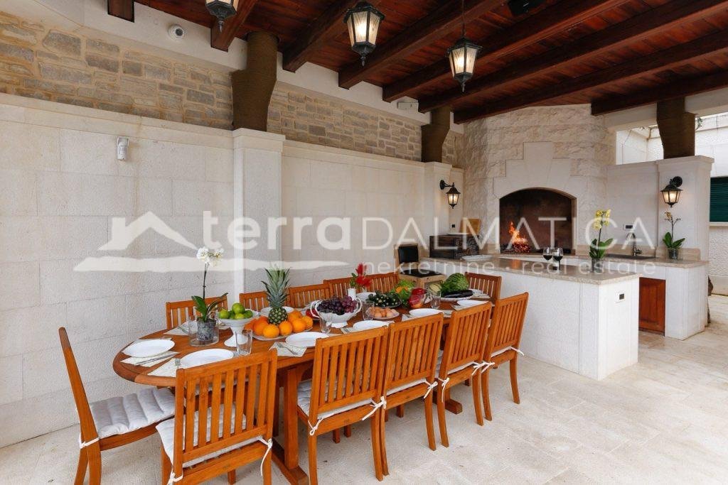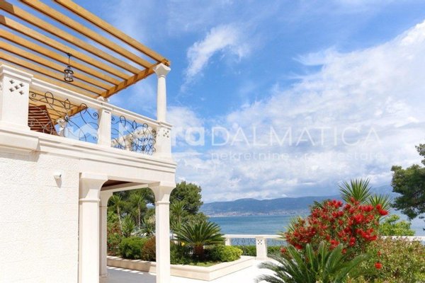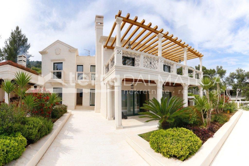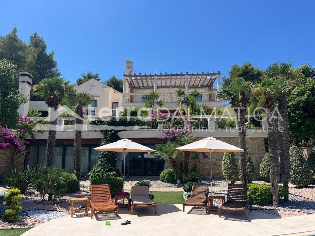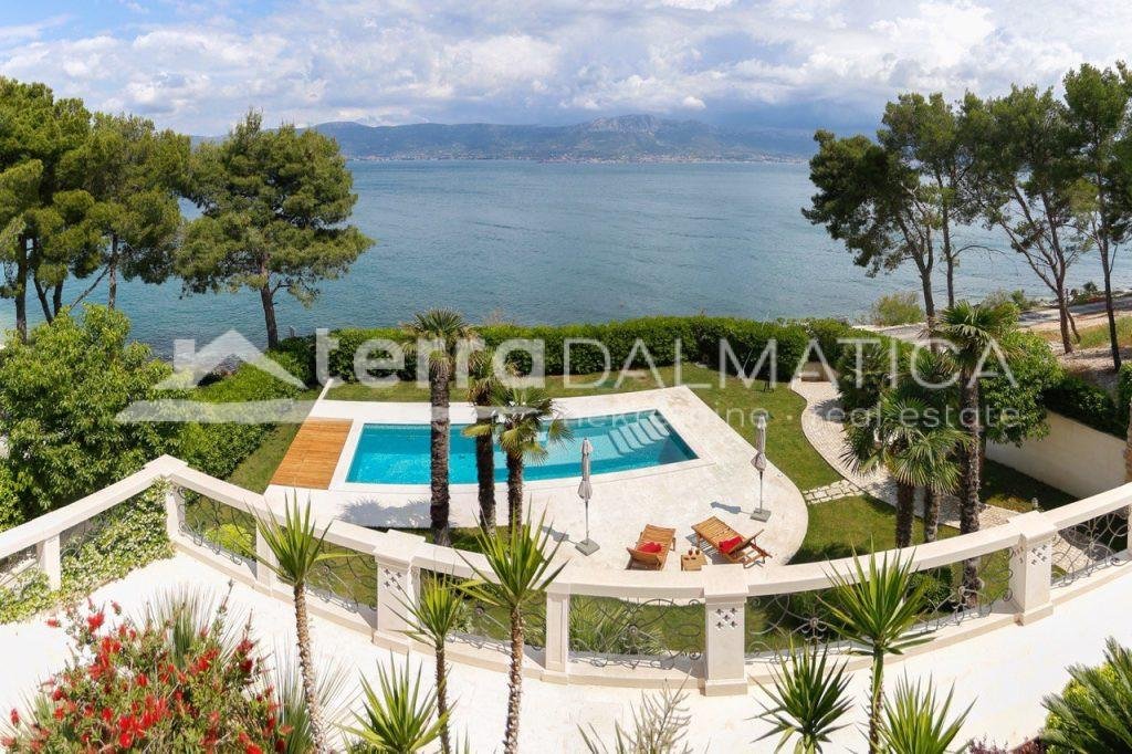 In einer einzigartigen Lage in Čiovo, nur zehn Meter vom Meer entfernt, steht eine luxuriöse Villa mit einer beeindruckenden Wohnfläche von 980 m² zum Verkauf, die sich auf einem Grundstück von 1370 m² befindet und aus dem berühmten Brač-Stein erbaut