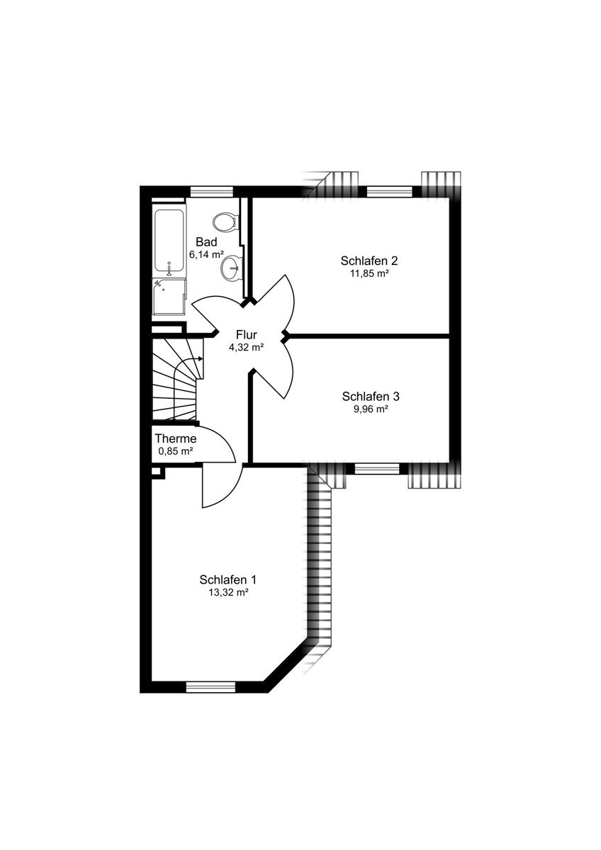 - Aufteilung im Obergeschoss optional mit 2 (aktuell) oder 3 Schlafzimmern (ursprünglich)