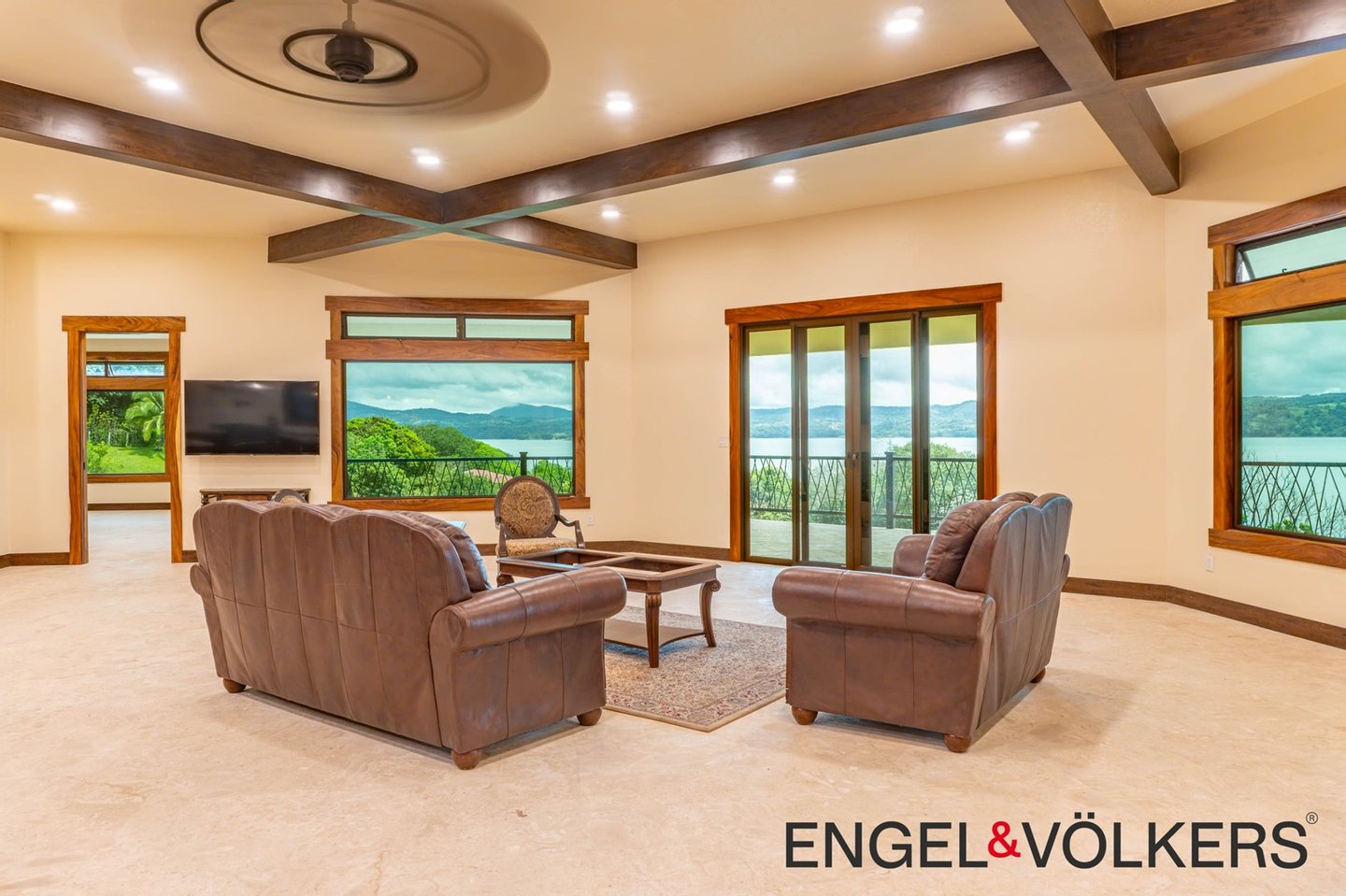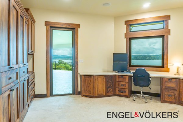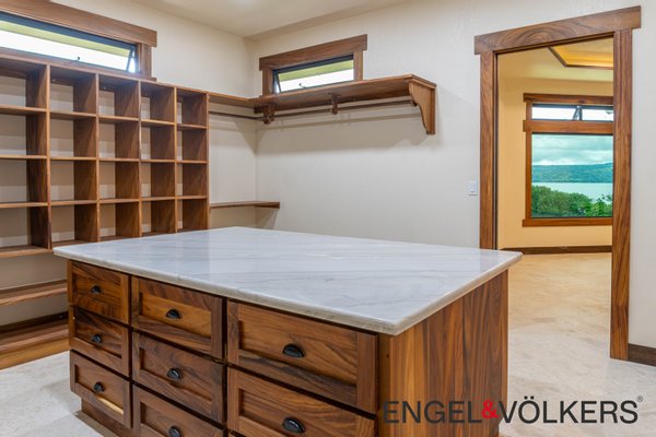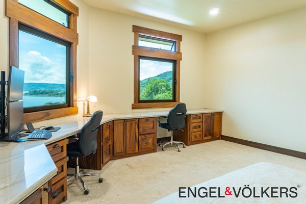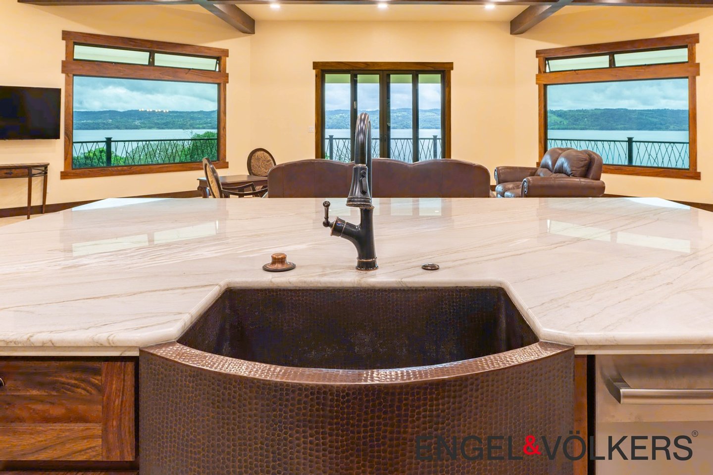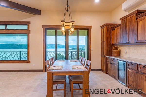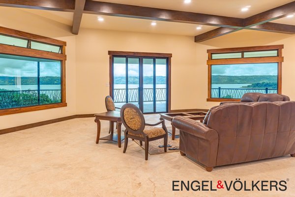 Vom Boden bis zur Decke reichende Dreh-Kipp-Fenster im europäischen Stil überspannen das gesamte Haus und bieten einen ungestörten Blick auf den See und den Vulkan. Der formelle Essbereich verfügt über einen eingebauten