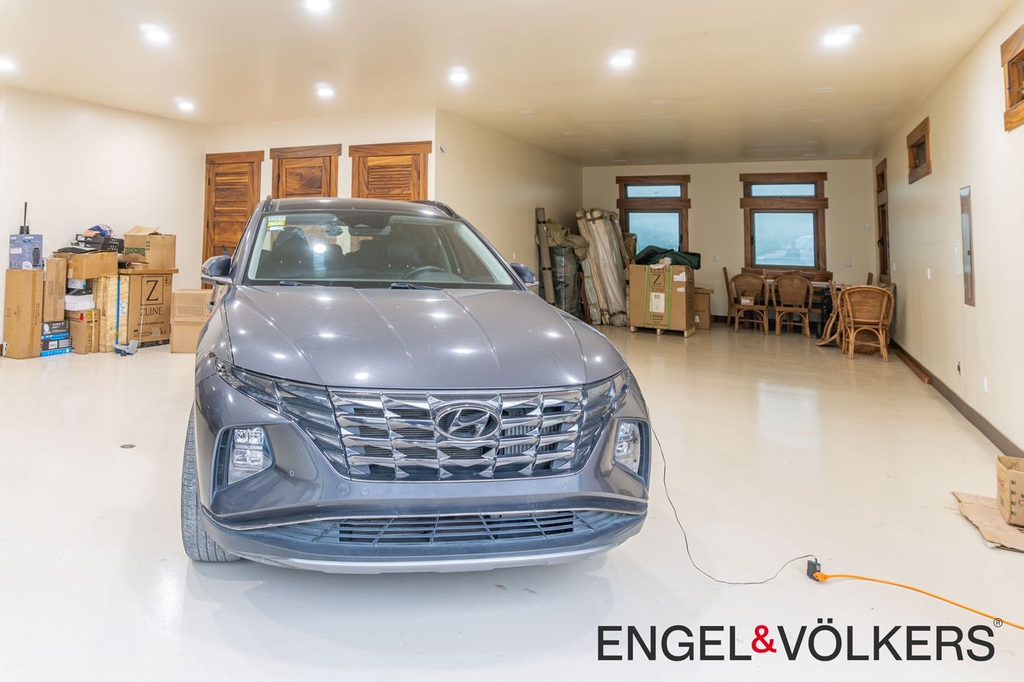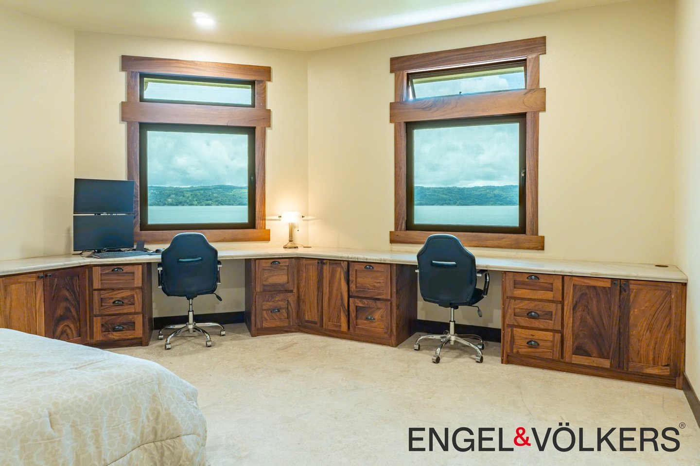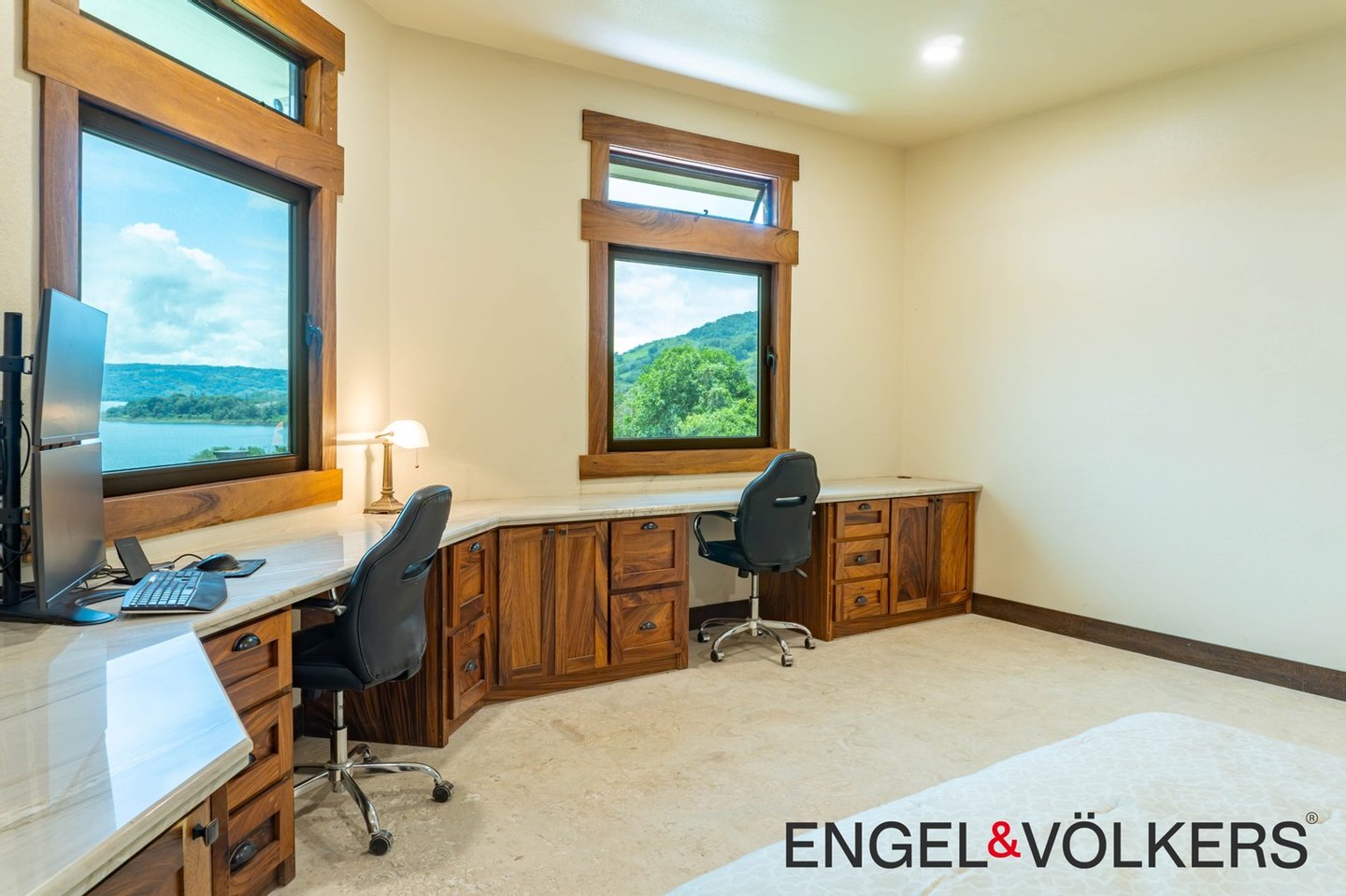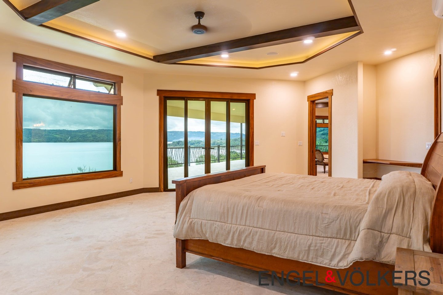 Vom Boden bis zur Decke reichende Dreh-Kipp-Fenster im europäischen Stil überspannen das gesamte Haus und bieten einen ungestörten Blick auf den See und den Vulkan. Der formelle Essbereich verfügt über einen eingebauten