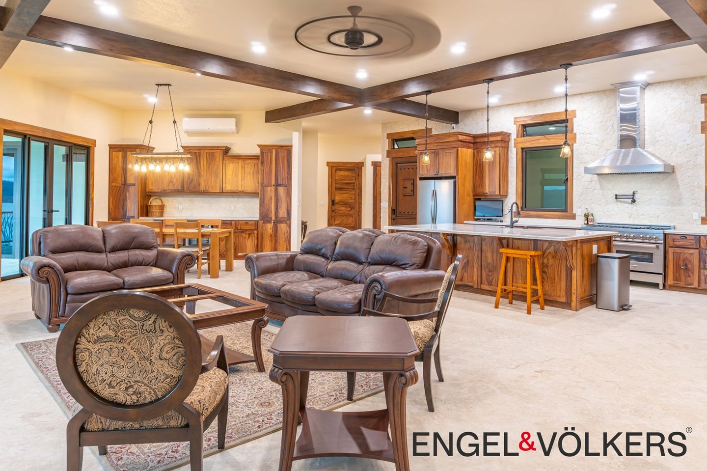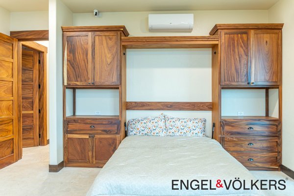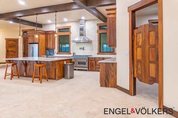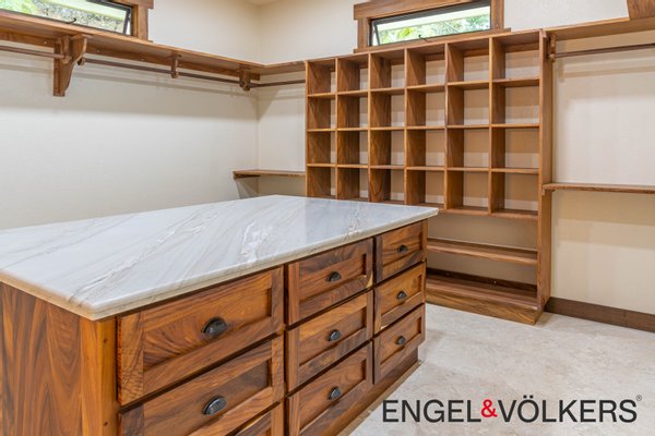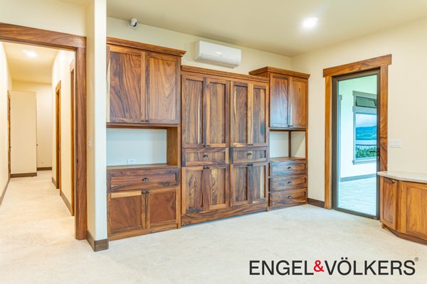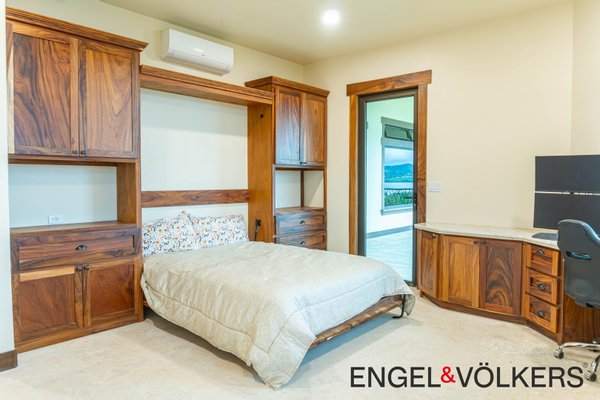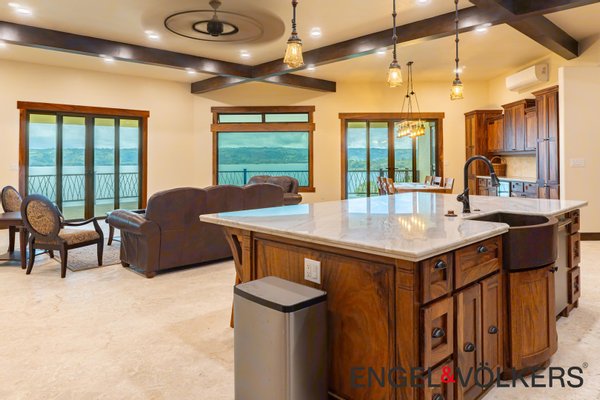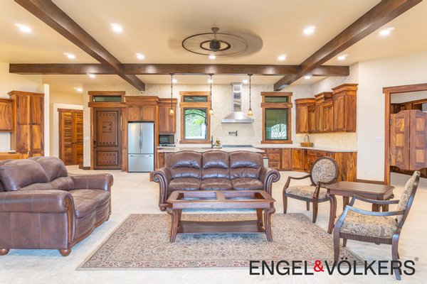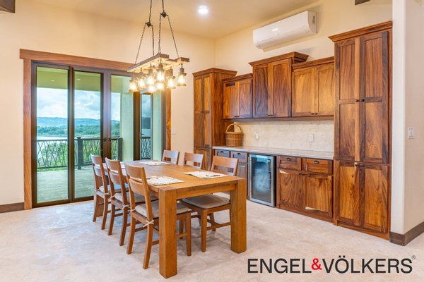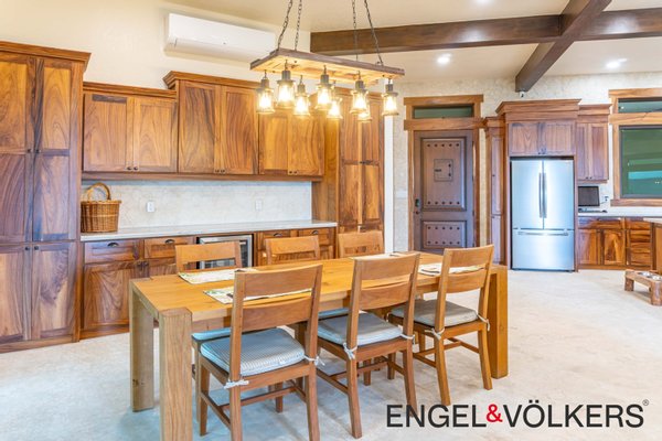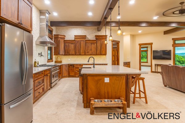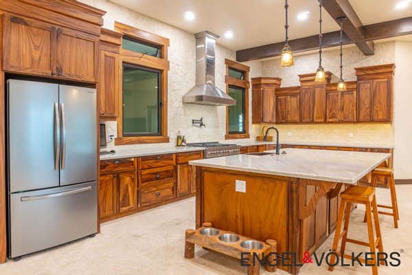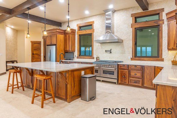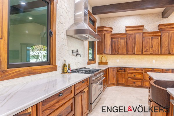 Im Herzen des Hauses befindet sich ein maßgefertigter großer Raum mit Türen, Schränken, Fußleisten und Verkleidungen aus massivem Guanacaste-Holz. Die Küche des Küchenchefs ist mit erstklassigen importierten ZLINE- und Bosch-Geräten, einer großen Insel, Quarzit-Arbeitsplatten und einer begehbaren Butler-Speisekammer mit Tiefkühltruhe, Spüle und zusätzlichen Guanacaste-Schränken ausgestattet. Es gibt importierte Kupferspülen im gesamten Haupthaus und in der Casita.