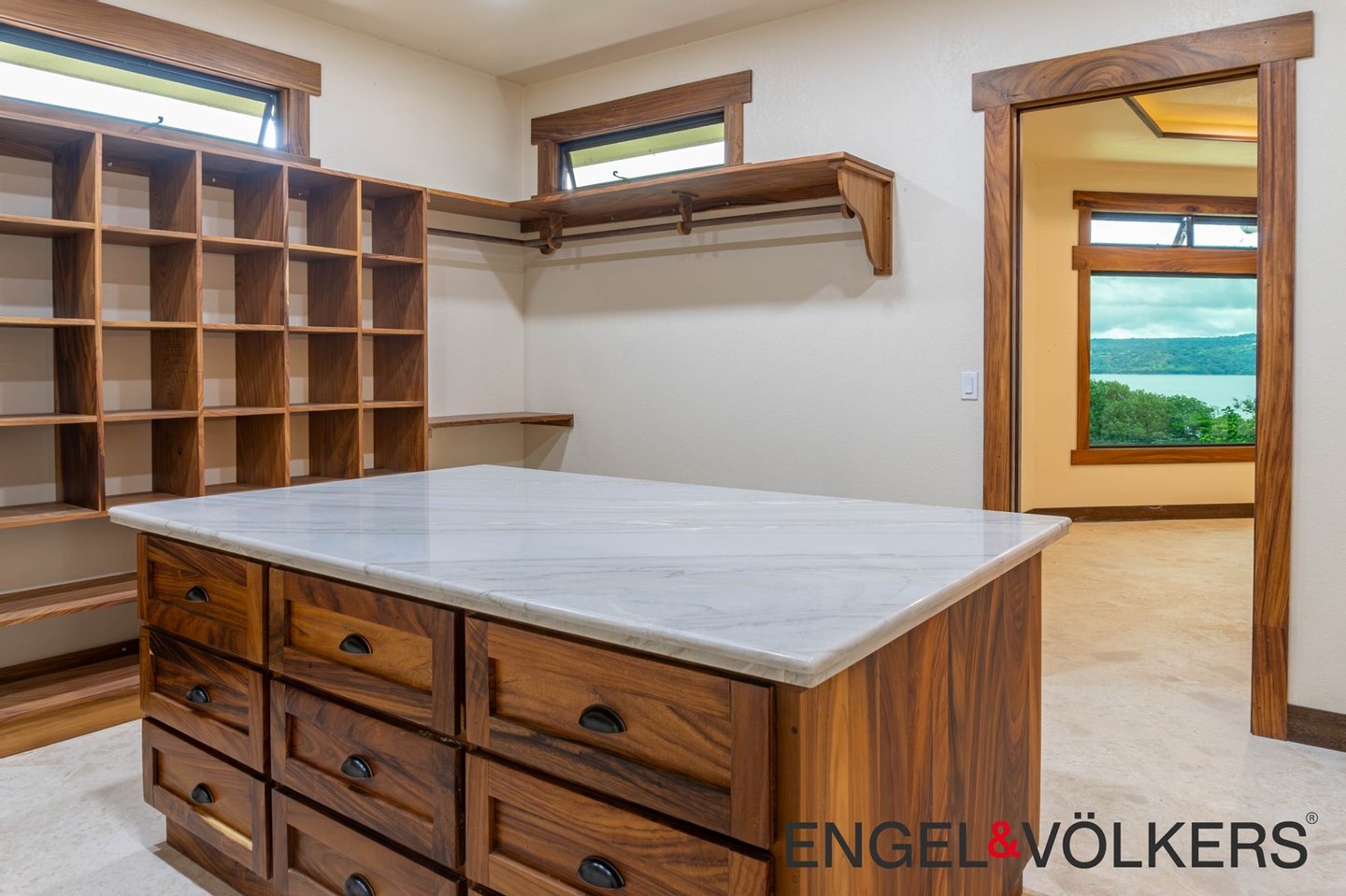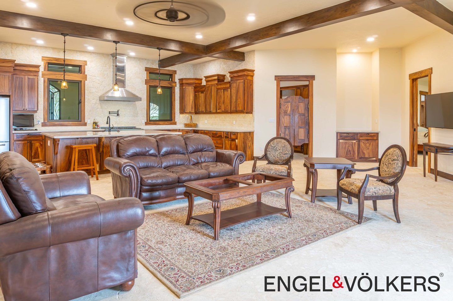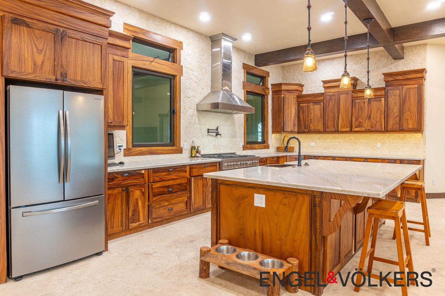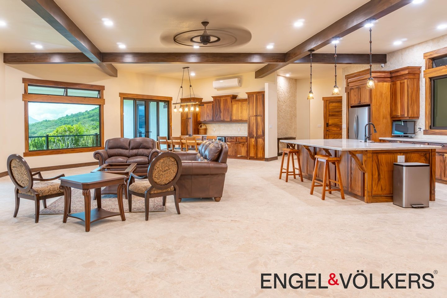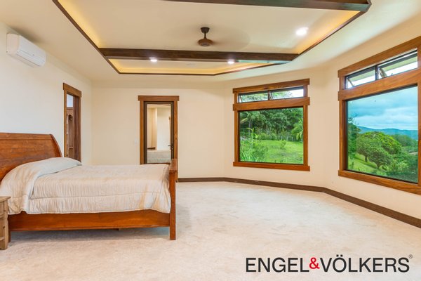Im Herzen des Hauses befindet sich ein maßgefertigter großer Raum mit Türen, Schränken, Fußleisten und Verkleidungen aus massivem Guanacaste-Holz. Die Küche des Küchenchefs ist mit erstklassigen importierten ZLINE- und Bosch-Geräten, einer großen Insel, Quarzit-Arbeitsplatten und einer begehbaren Butler-Speisekammer mit Tiefkühltruhe, Spüle und zusätzlichen Guanacaste-Schränken ausgestattet. Es gibt importierte Kupferspülen im gesamten Haupthaus und in der Casita.