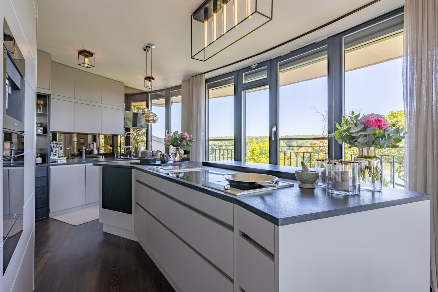 Der weitläufige Wohn-Essbereich mit offener Luxusküche (u. a. Gaggenau-Geräte, Teppanyaki, Wokkochfeld, Wasseraufbereitungsanlage, Mielegeräte ) wird von umlaufenden Fensterfronten eingerahmt, die nicht nur maximale Helligkeit, sondern auch einen spektakulären Weitblick auf das Wasser und Potsdams berühmte Kulturlandschaft eröffnen.