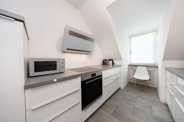 Die moderne, großzügige Küche wird durch eine weitere breite Fenstergaube in Südostlage inklusive grünem Blick in den Innenhof angenehm erhellt. In glänzendem Weiß gestaltet, überzeugt sie nicht nur optisch, sondern auch durch ihre hochwertige Markenausstattung: ein Induktionsherd, ein Backofen und eine Spülmaschine von „Bosch“ sowie ein leistungsstarker Dunstabzug von „Gutmann“. Dank durchdachter Stauraumlösungen vereint diese Einbauküche von 2020 Effizienz, Komfort und Alltagstauglichkeit auf ansprechende Weise.