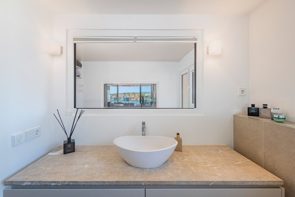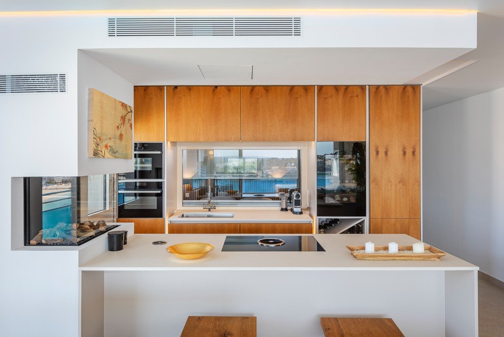 Darüber hinaus ist die Wohnung als offener Wohn-Ess-Küchenbereich mit Meeres-Panoramablick, einem Kamin und einem Weinkühlschrank aufgeteilt. Ein weiterer toller Faktor sind die großen Fenster im Hauptschlafzimmer, die den Hauptwohnbereich und das Badezimmer trennen, sodass Sie den Meerblick von jedem Zimmer aus genießen können. Das Hauptschlafzimmer hat auch einen Ausgang zum Balkon, wo Sie mehr Stauraum und natürlich viel Licht haben. Zusätzlich haben Sie zwei weitere einzelne Zimmer, die sich ein Badezimmer teilen.